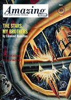 The Project Gutenberg EBook of The Stars, My Brothers, by Edmond Hamilton This eBook is for the use of anyone anywhere at no cost and with almost no restrictions whatsoever. You may copy it, give it away or re-use it under the terms of the Project Gutenberg License included with this eBook or online at www.gutenberg.org Title: The Stars, My Brothers Author: Edmond Hamilton Illustrator: Virgil Finlay Release Date: March 18, 2008 [EBook #24870] Language: English Character set encoding: ISO-8859-1 *** START OF THIS PROJECT GUTENBERG EBOOK THE STARS, MY BROTHERS *** Produced by Greg Weeks, Stephen Blundell and the Online Distributed Proofreading Team at https://www.pgdp.net