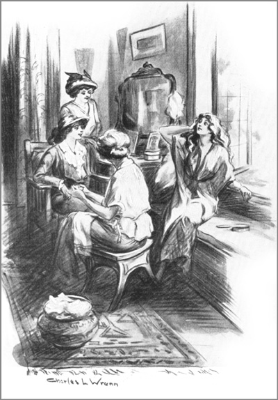 "Wait until I make my annual inspection," ordered Judy, carefully examining the fourth finger of the left hand of every girl. "No rings or marks of rings," she said at each inspection until she came to Jessie, who was endeavoring to sit on her left hand while she pushed Judy away with her right. "Now, Jessica, no concealments," cried Judy, "and from your seven bosom friends! It's not fair. Are you actually wearing a solitaire?"