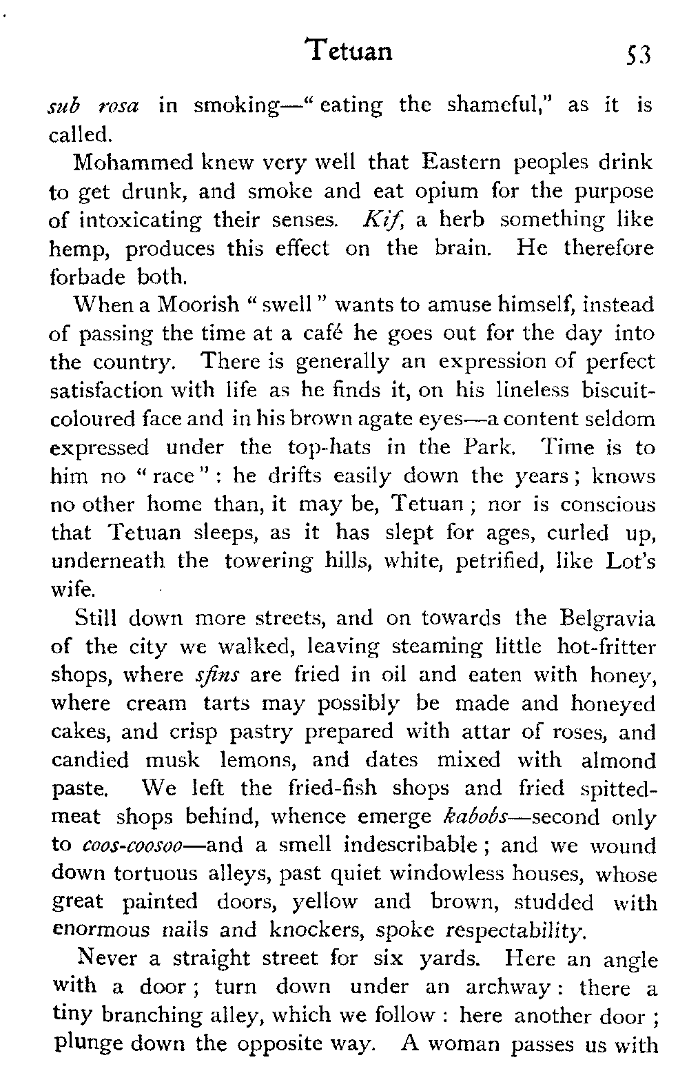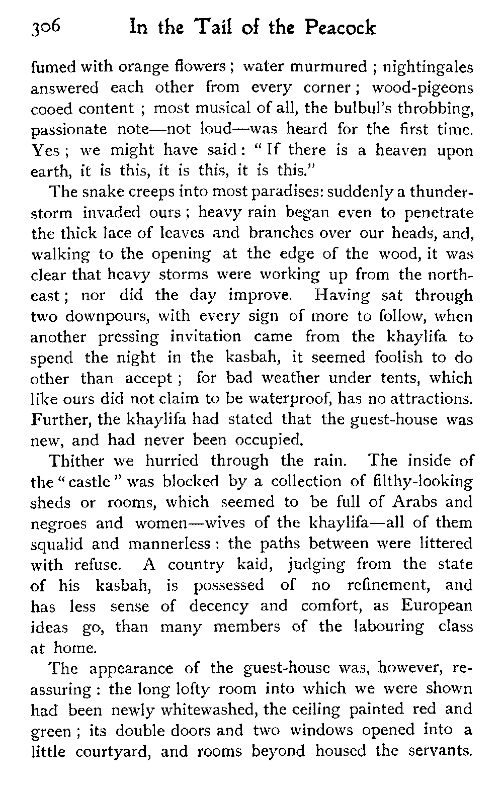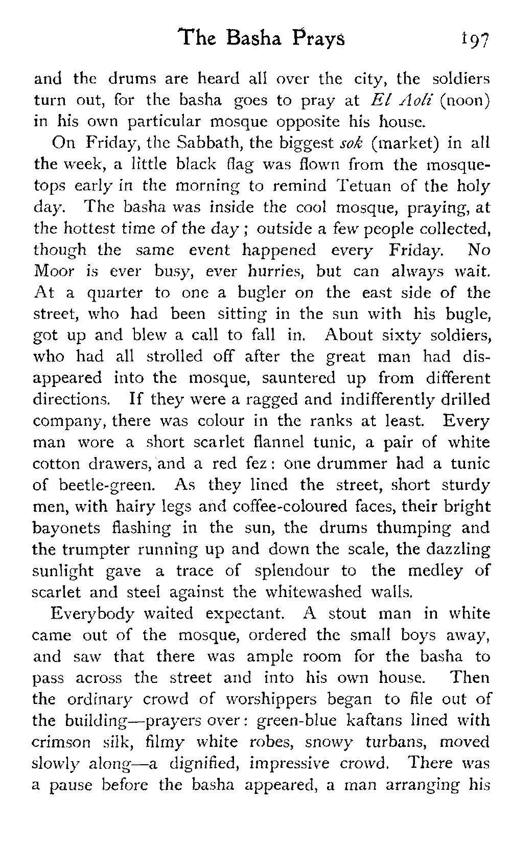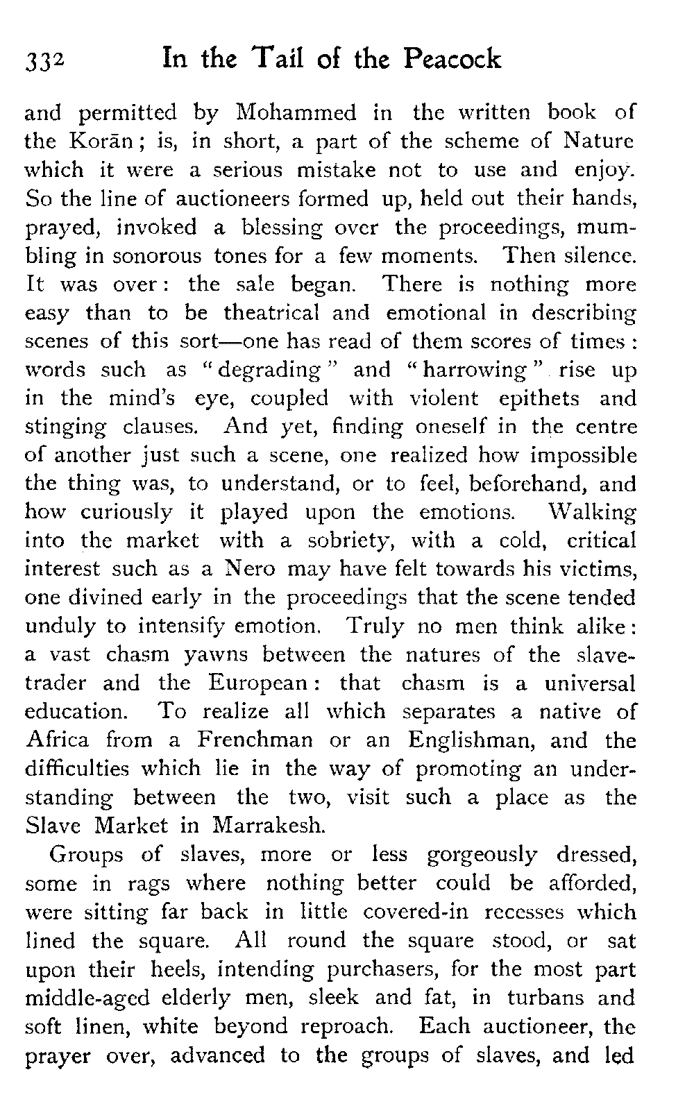 The vague and hazy ideals which the white light of an English upbringing relegates to dreamland and dismisses as idle fancies, rise up in the glare of African sunlight, alive, tangible, unashamed; the things that are, not the things that might be:—the vivid colouring, the hot crowding, the stately men and veiled women, the despotism and stoicism, the unchanging picturesqueness of the Thousand and One Nights, the dramatic inevitability of the Old Testament.—A. J. D.