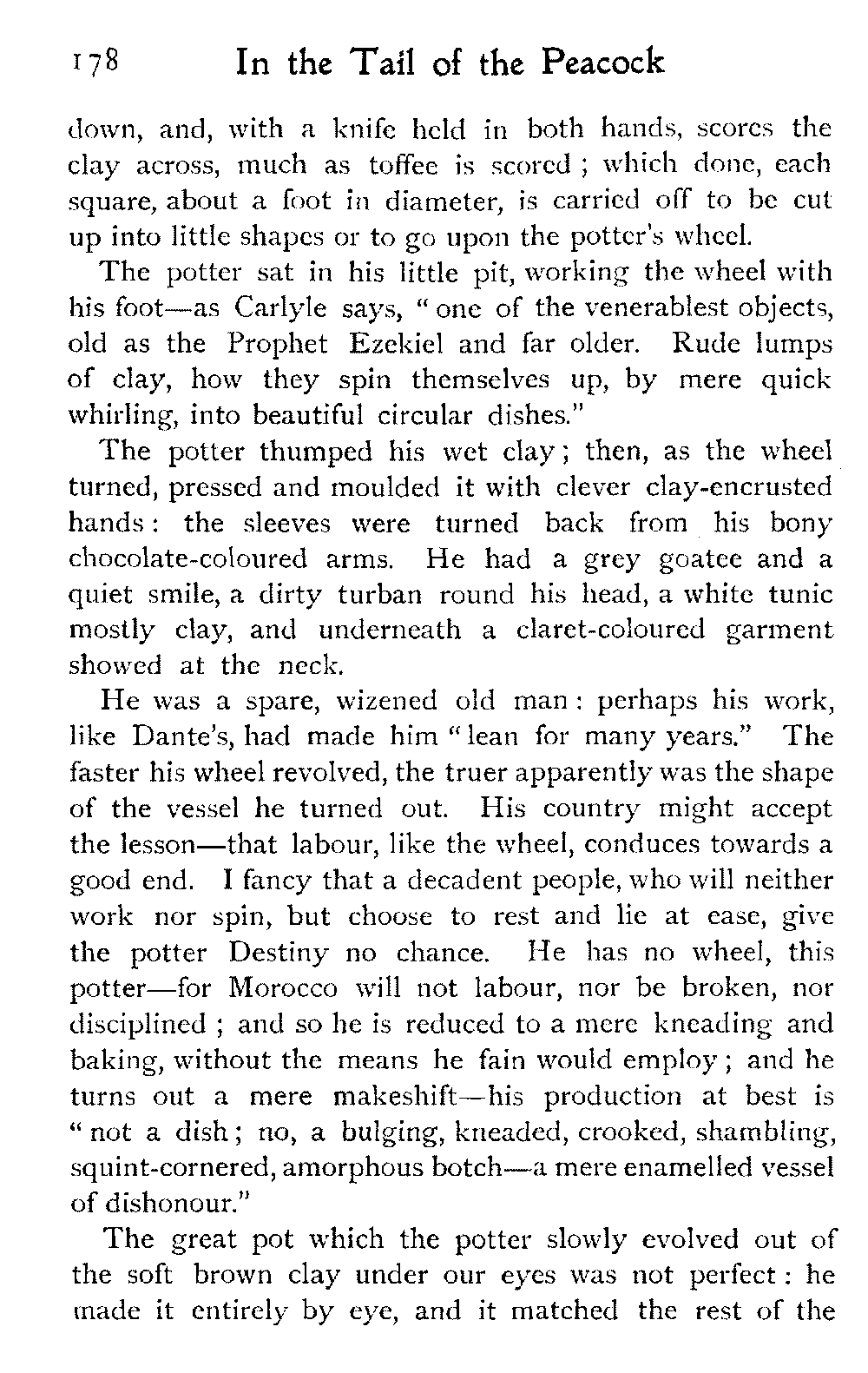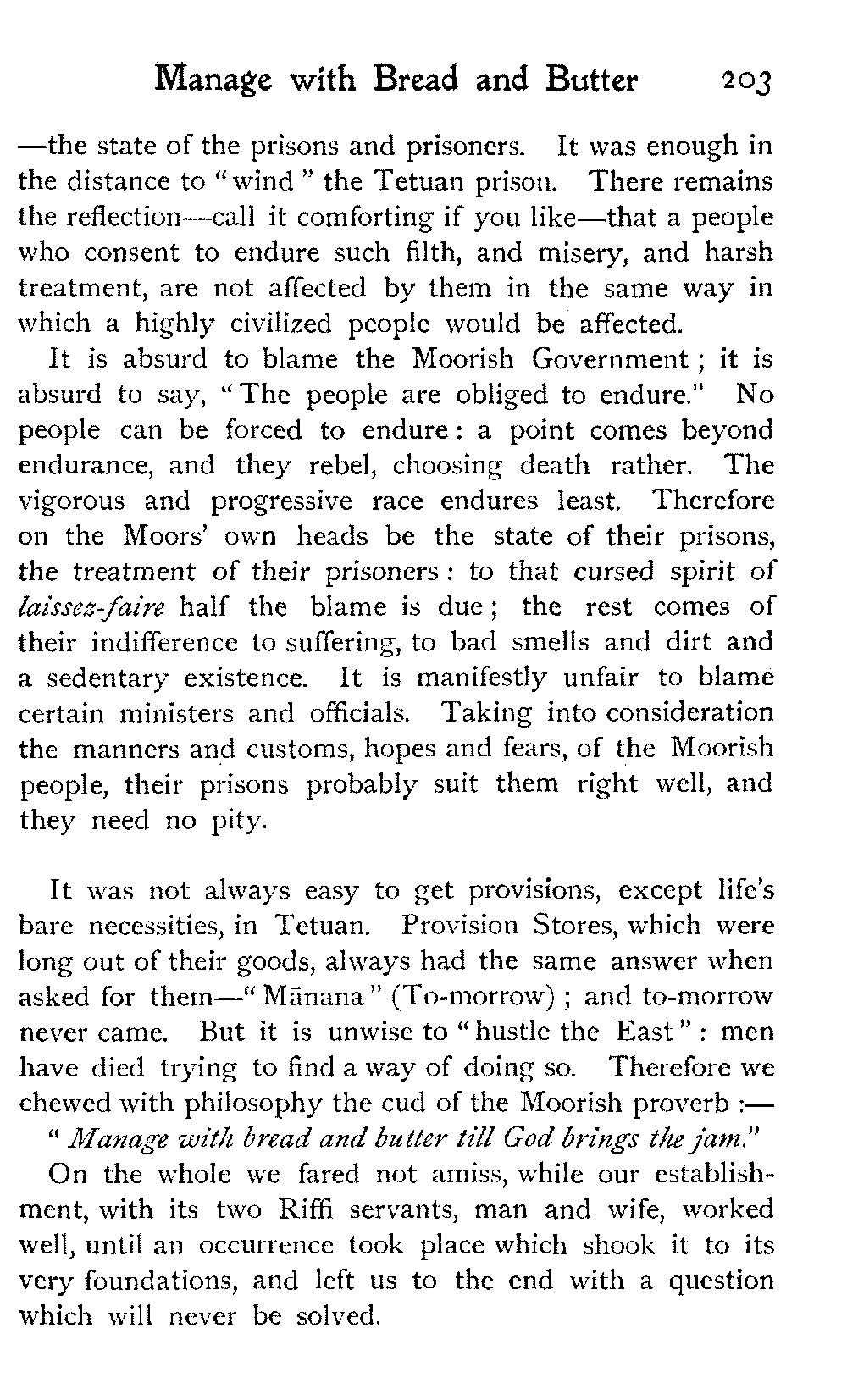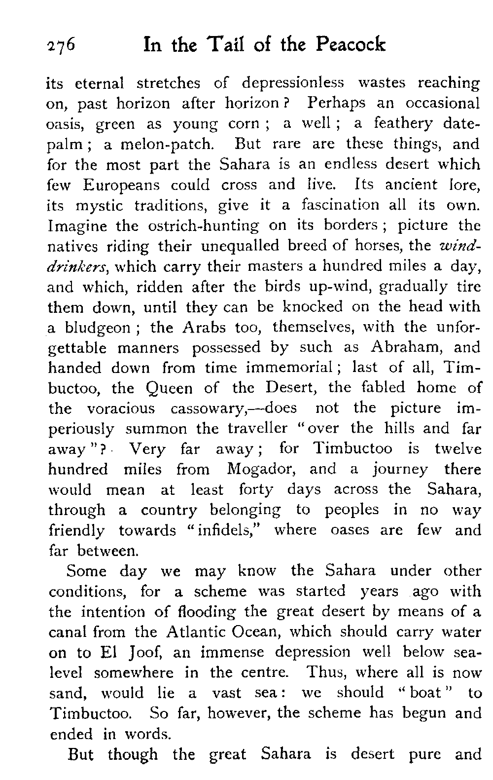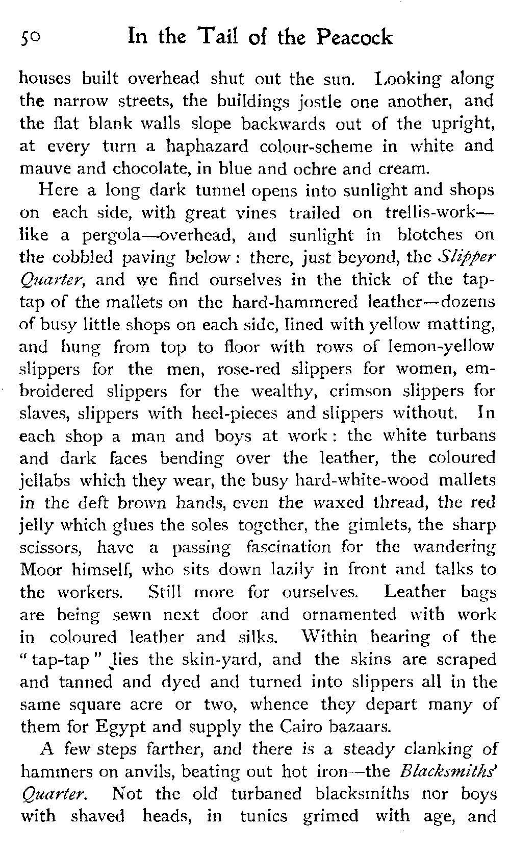 The vague and hazy ideals which the white light of an English upbringing relegates to dreamland and dismisses as idle fancies, rise up in the glare of African sunlight, alive, tangible, unashamed; the things that are, not the things that might be:—the vivid colouring, the hot crowding, the stately men and veiled women, the despotism and stoicism, the unchanging picturesqueness of the Thousand and One Nights, the dramatic inevitability of the Old Testament.—A. J. D.