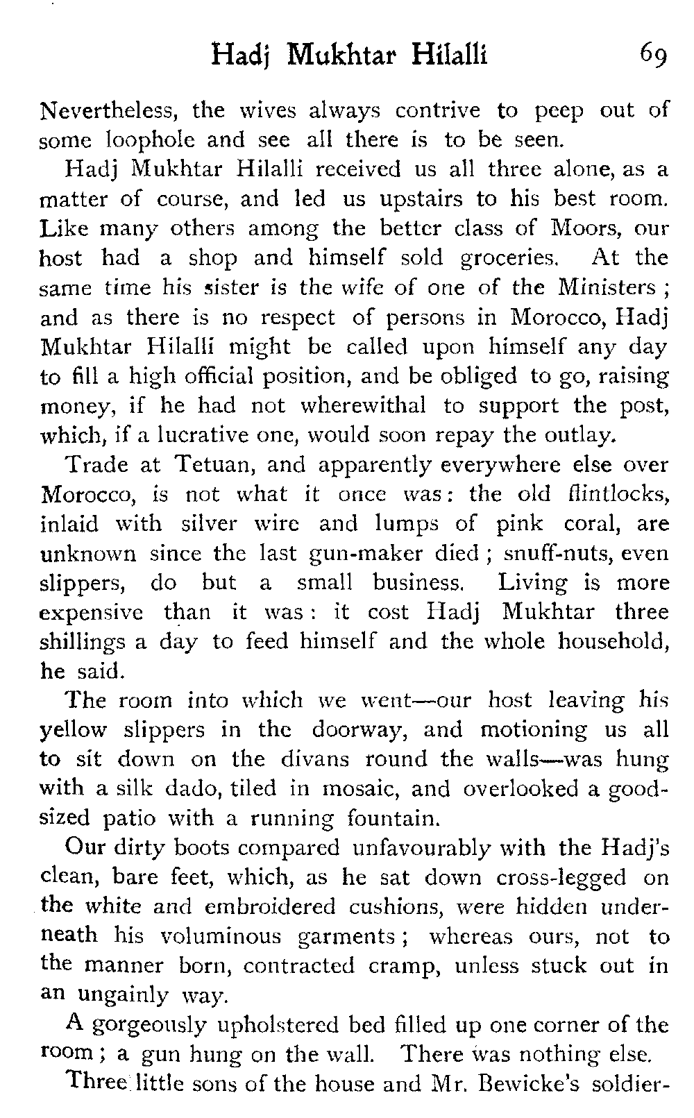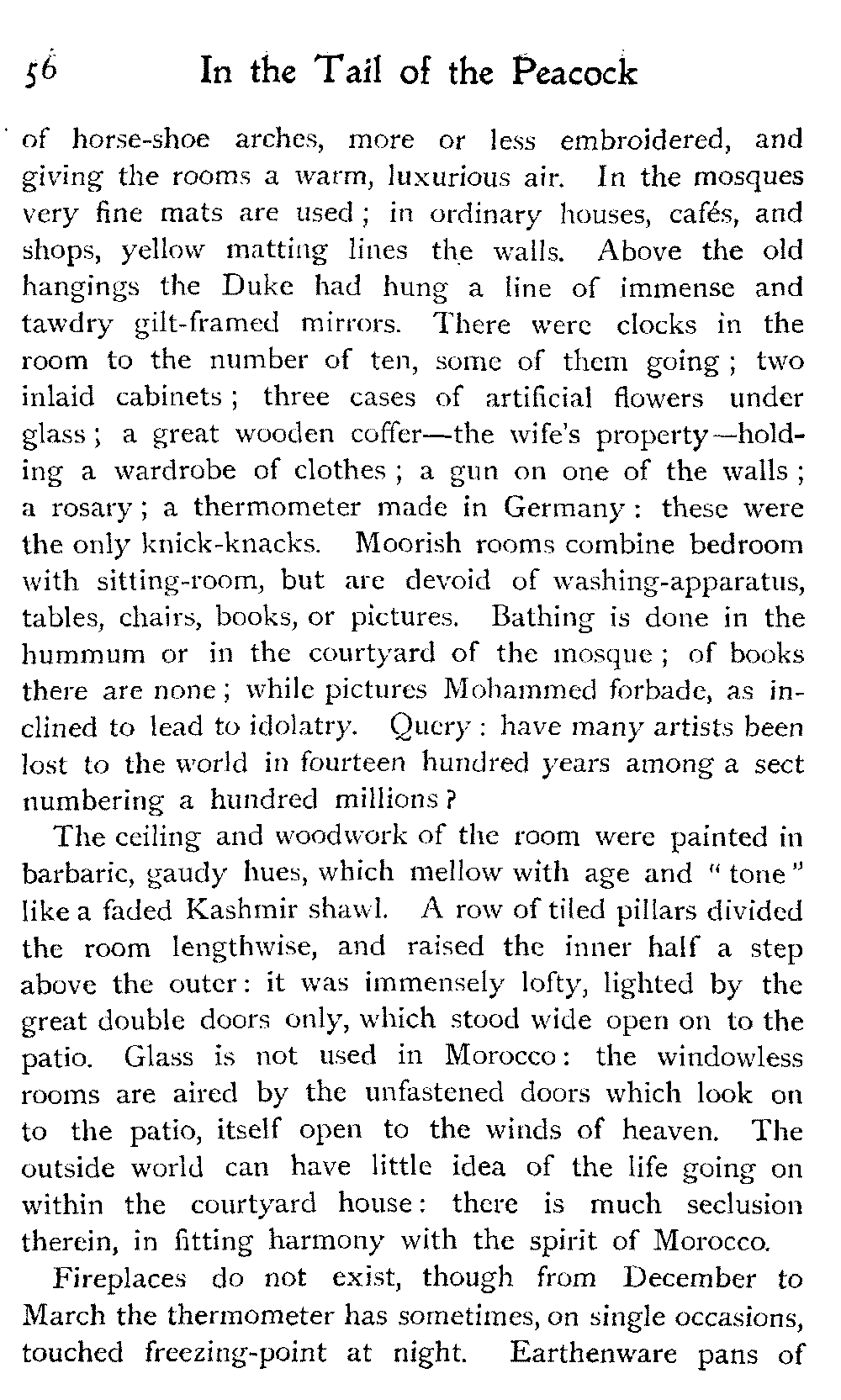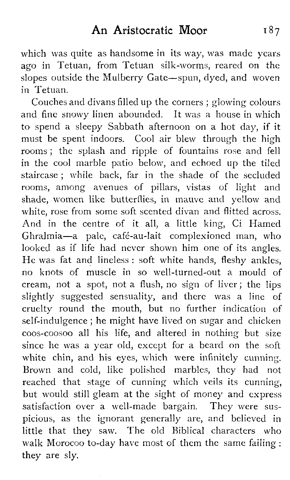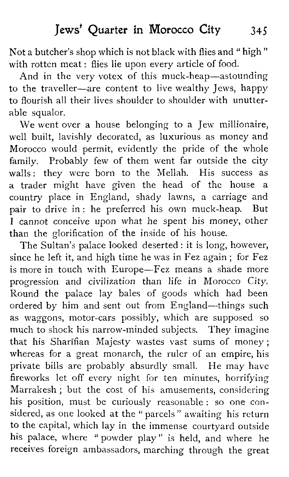 We went over a house belonging to a Jew millionaire, well built, lavishly decorated, as luxurious as money and Morocco would permit, evidently the pride of the whole family. Probably few of them went far outside the city walls: they were born to the Mellah. His success as a trader might have given the head of the house a country place in England, shady lawns, a carriage and pair to drive in: he preferred his own muck-heap. But I cannot conceive upon what he spent his money, other than the glorification of the inside of his house.