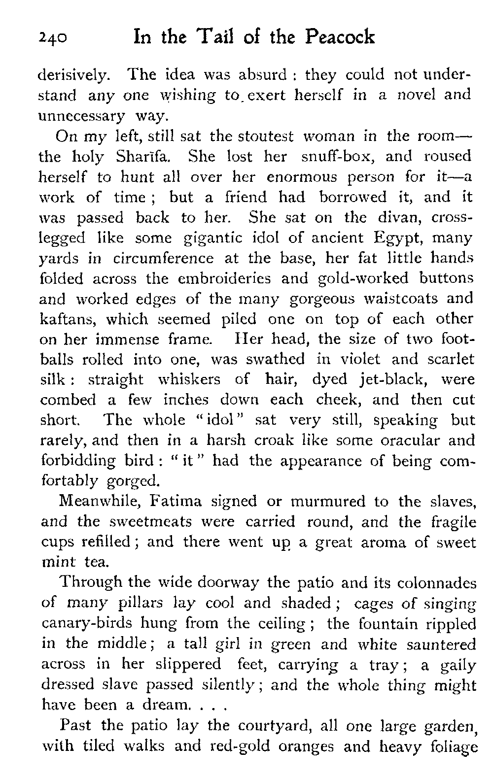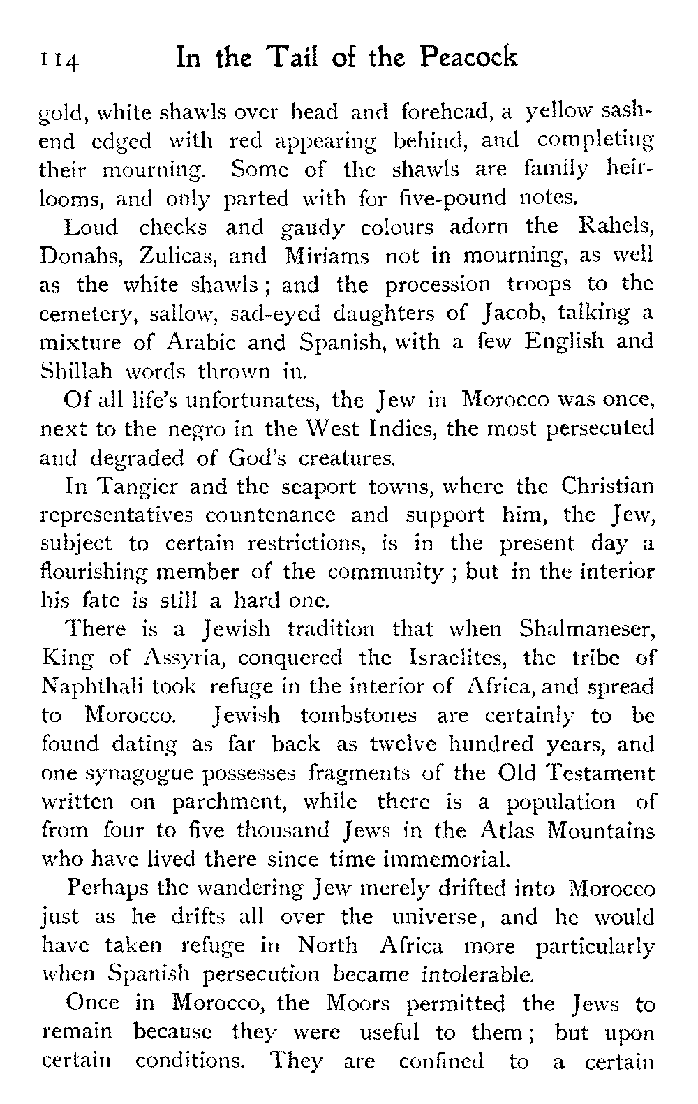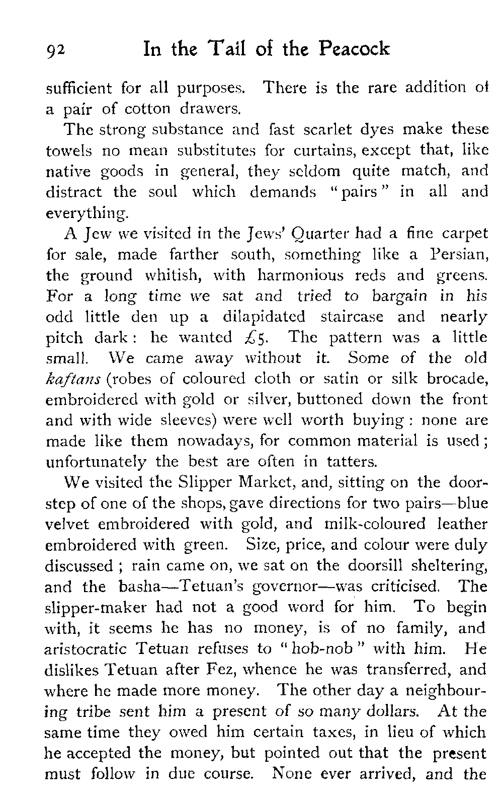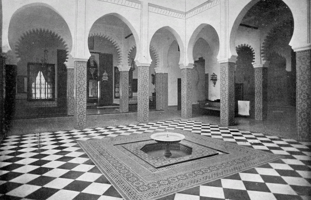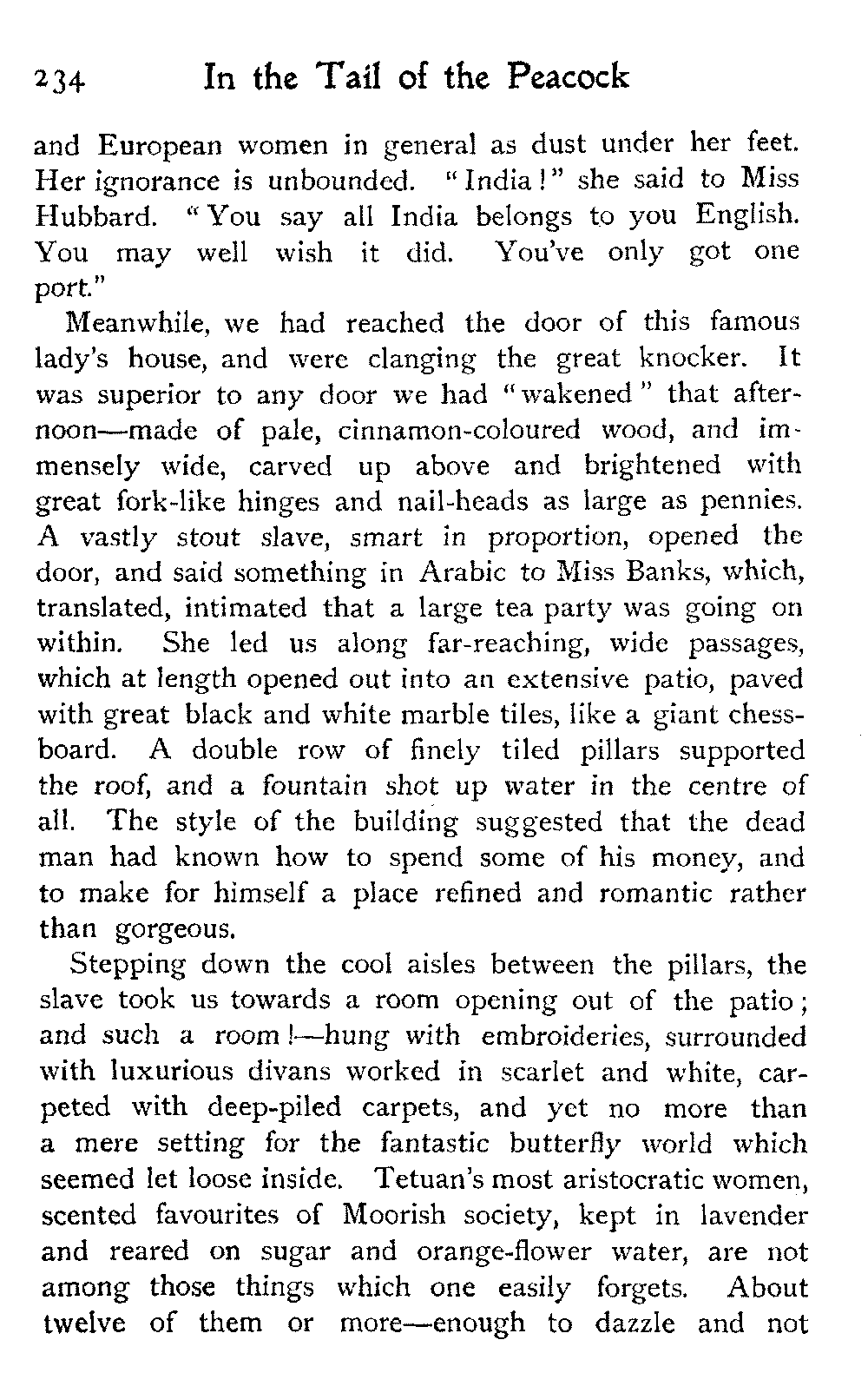 We went over a house belonging to a Jew millionaire, well built, lavishly decorated, as luxurious as money and Morocco would permit, evidently the pride of the whole family. Probably few of them went far outside the city walls: they were born to the Mellah. His success as a trader might have given the head of the house a country place in England, shady lawns, a carriage and pair to drive in: he preferred his own muck-heap. But I cannot conceive upon what he spent his money, other than the glorification of the inside of his house.
