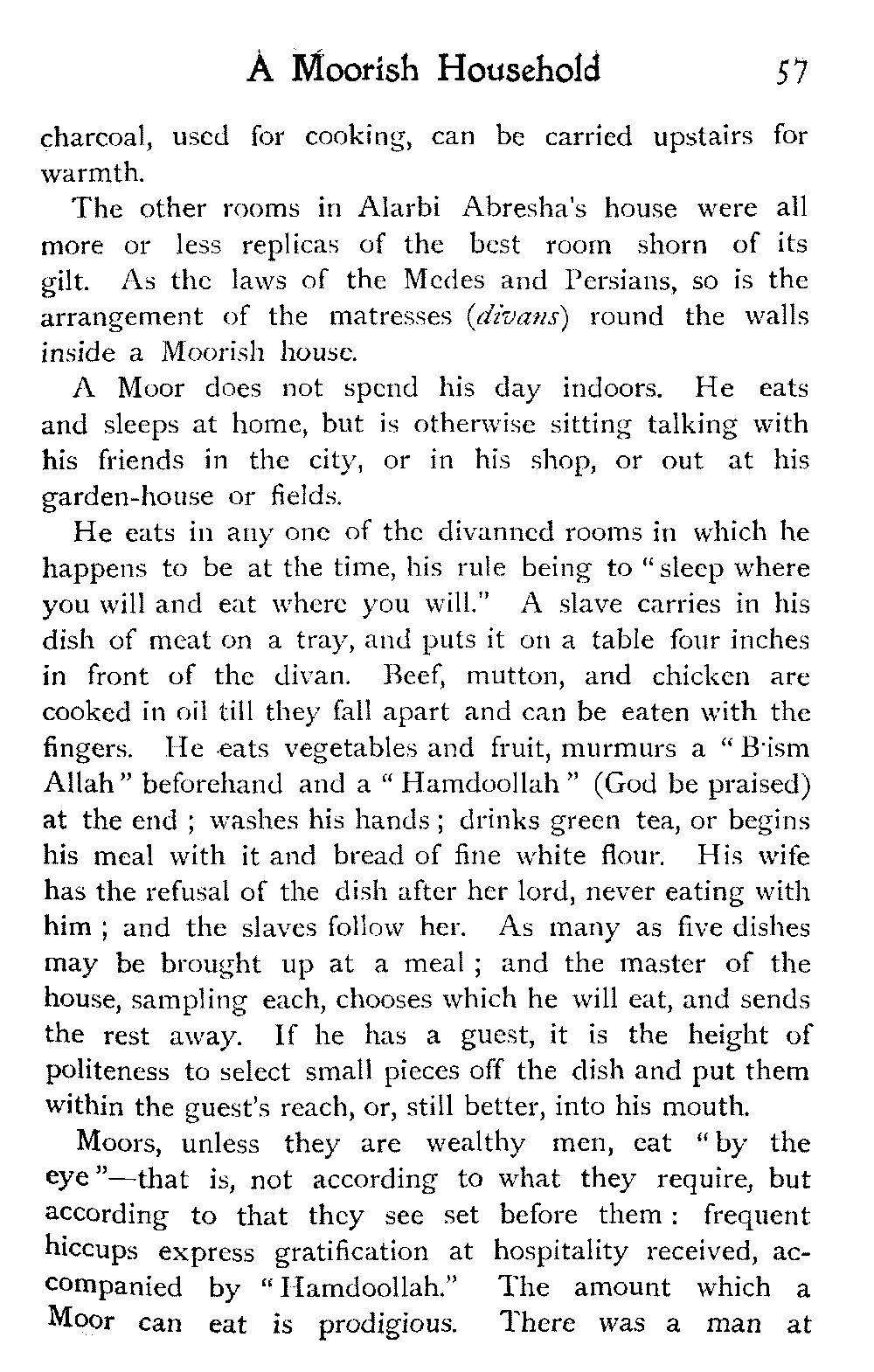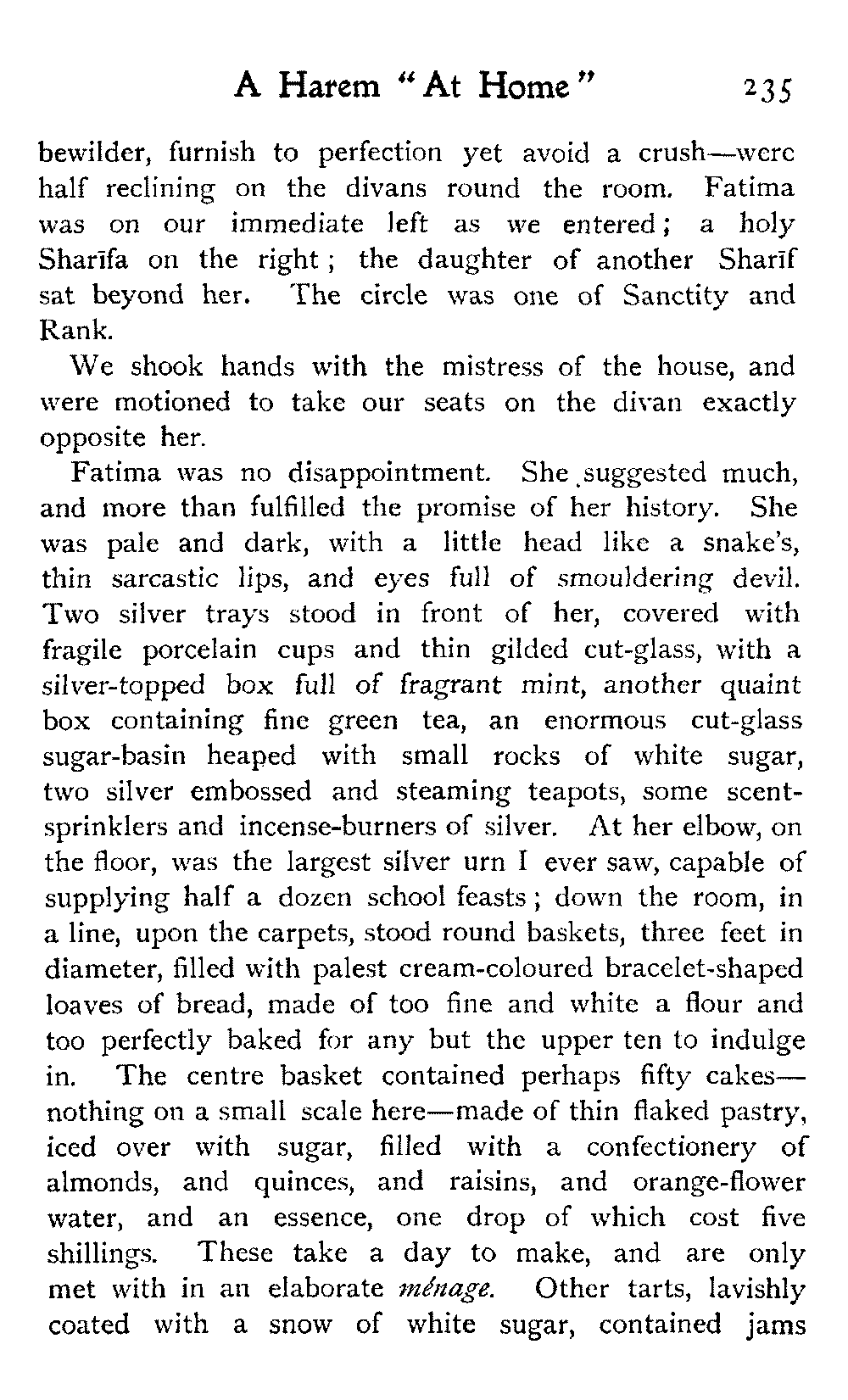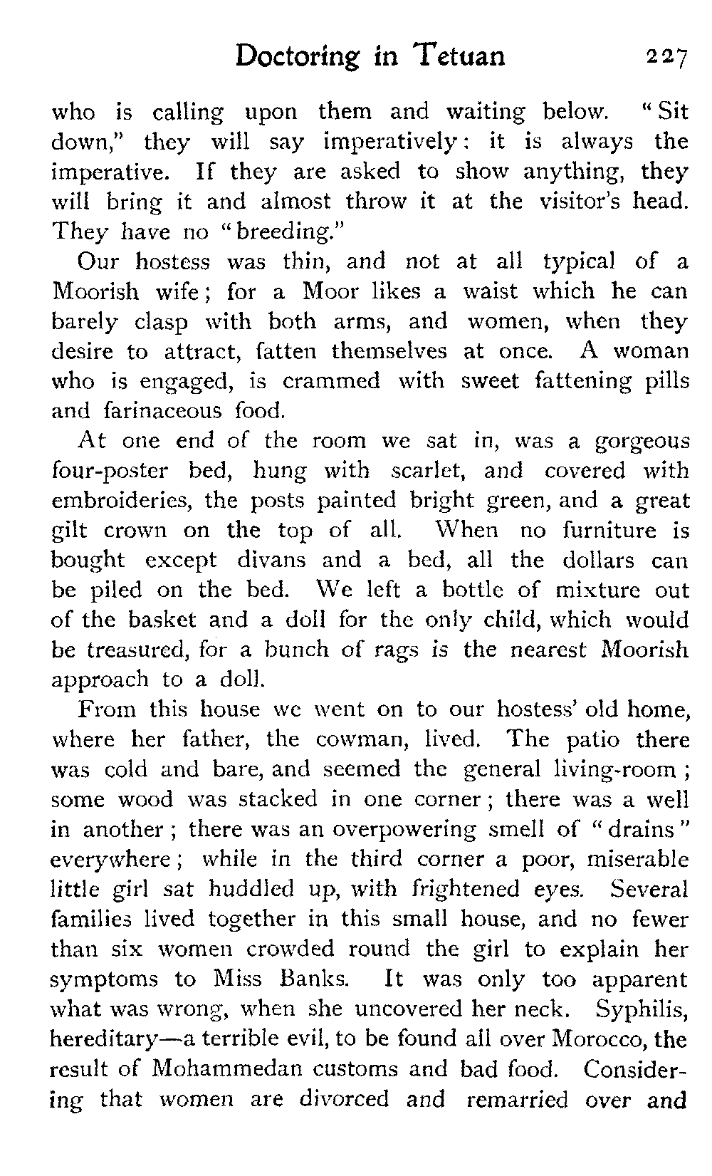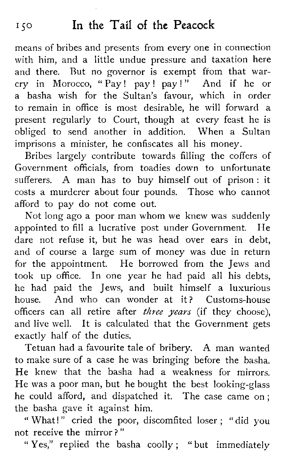 We went over a house belonging to a Jew millionaire, well built, lavishly decorated, as luxurious as money and Morocco would permit, evidently the pride of the whole family. Probably few of them went far outside the city walls: they were born to the Mellah. His success as a trader might have given the head of the house a country place in England, shady lawns, a carriage and pair to drive in: he preferred his own muck-heap. But I cannot conceive upon what he spent his money, other than the glorification of the inside of his house.
