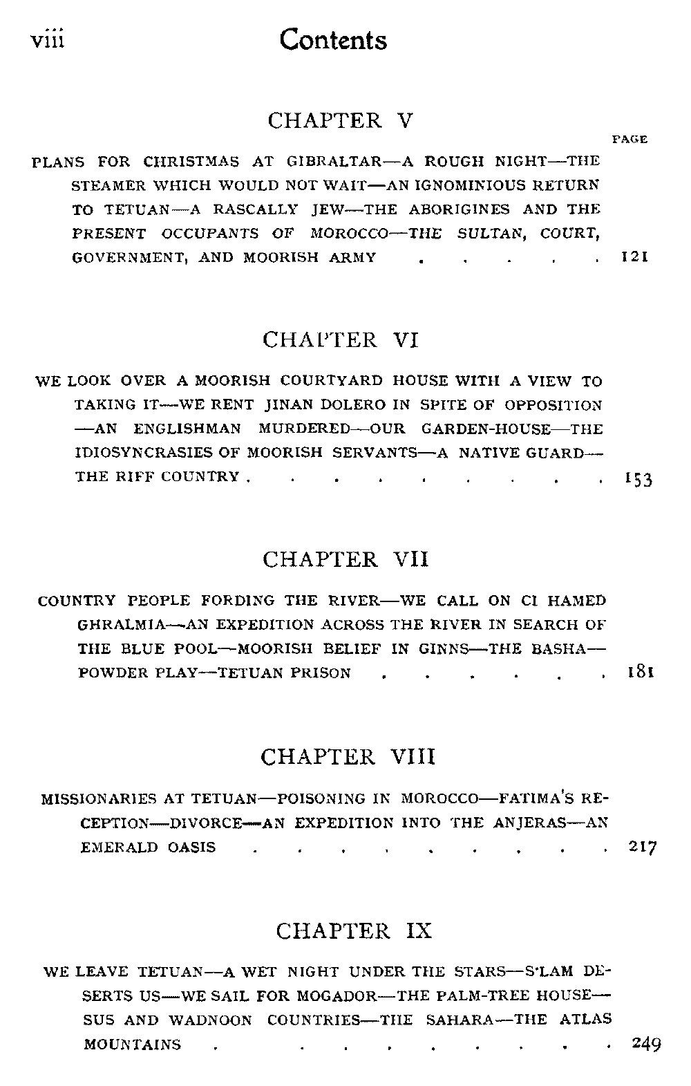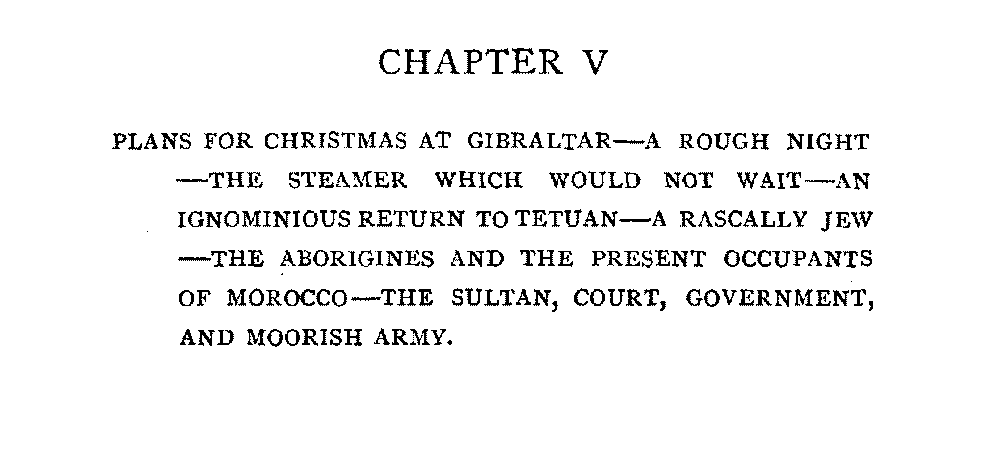 [viii]Chapter V | Plans for Christmas at Gibraltar—A Rough Night—The Steamer which would not Wait—An Ignominious Return to Tetuan—A Rascally Jew—The Aborigines and the Present Occupants of Morocco—The Sultan, Court, Government, and Moorish Army | 121 |