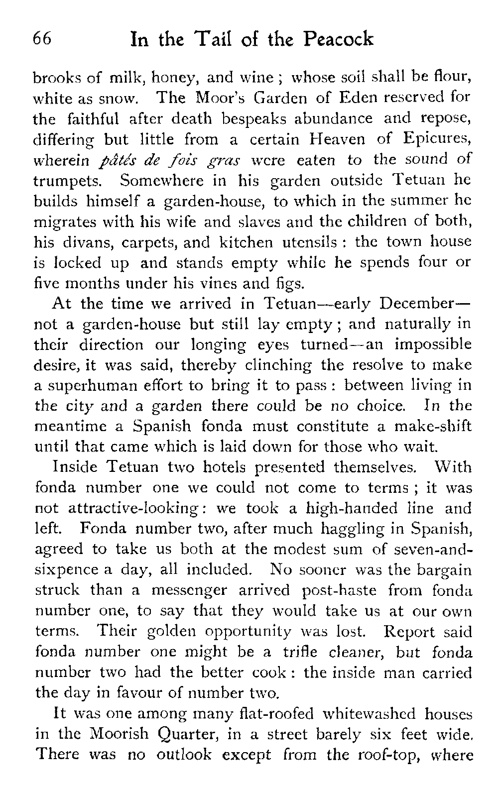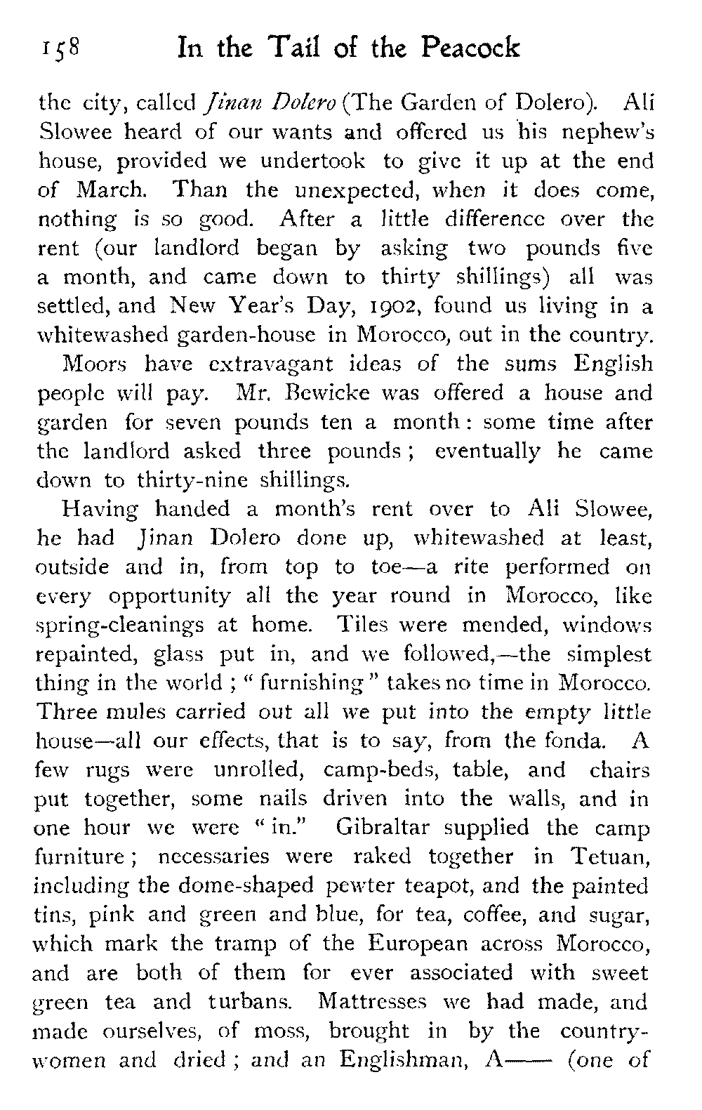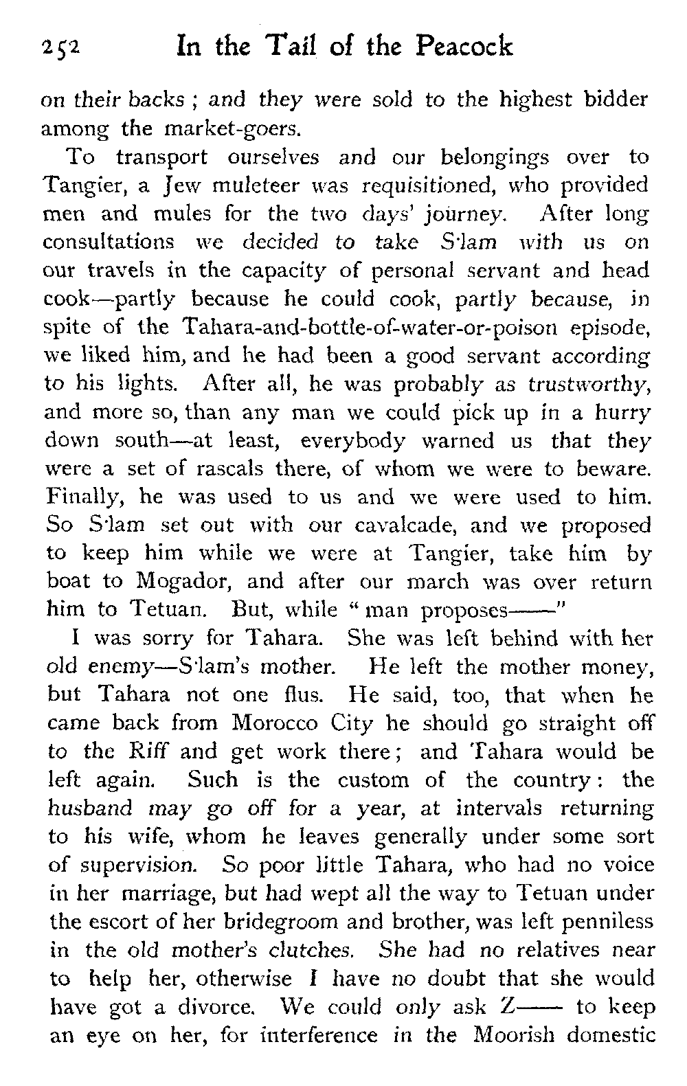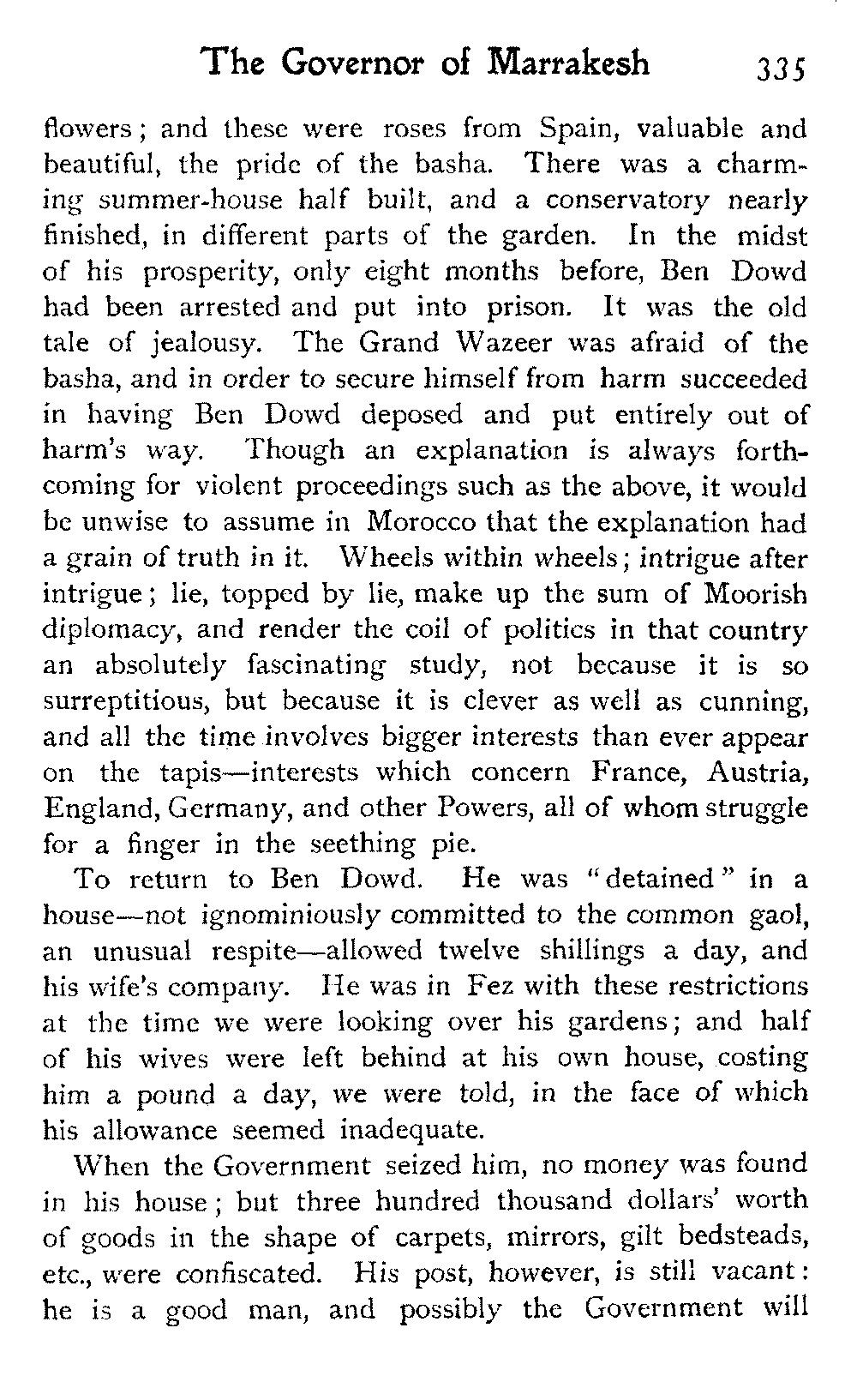 To return to Ben Dowd. He was "detained" in a house—not ignominiously committed to the common gaol, an unusual respite—allowed twelve shillings a day, and his wife's company. He was in Fez with these restrictions at the time we were looking over his gardens; and half of his wives were left behind at his own house, costing him a pound a day, we were told, in the face of which his allowance seemed inadequate.