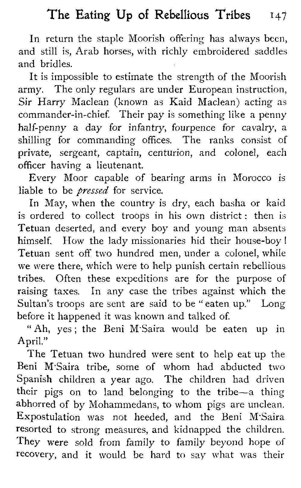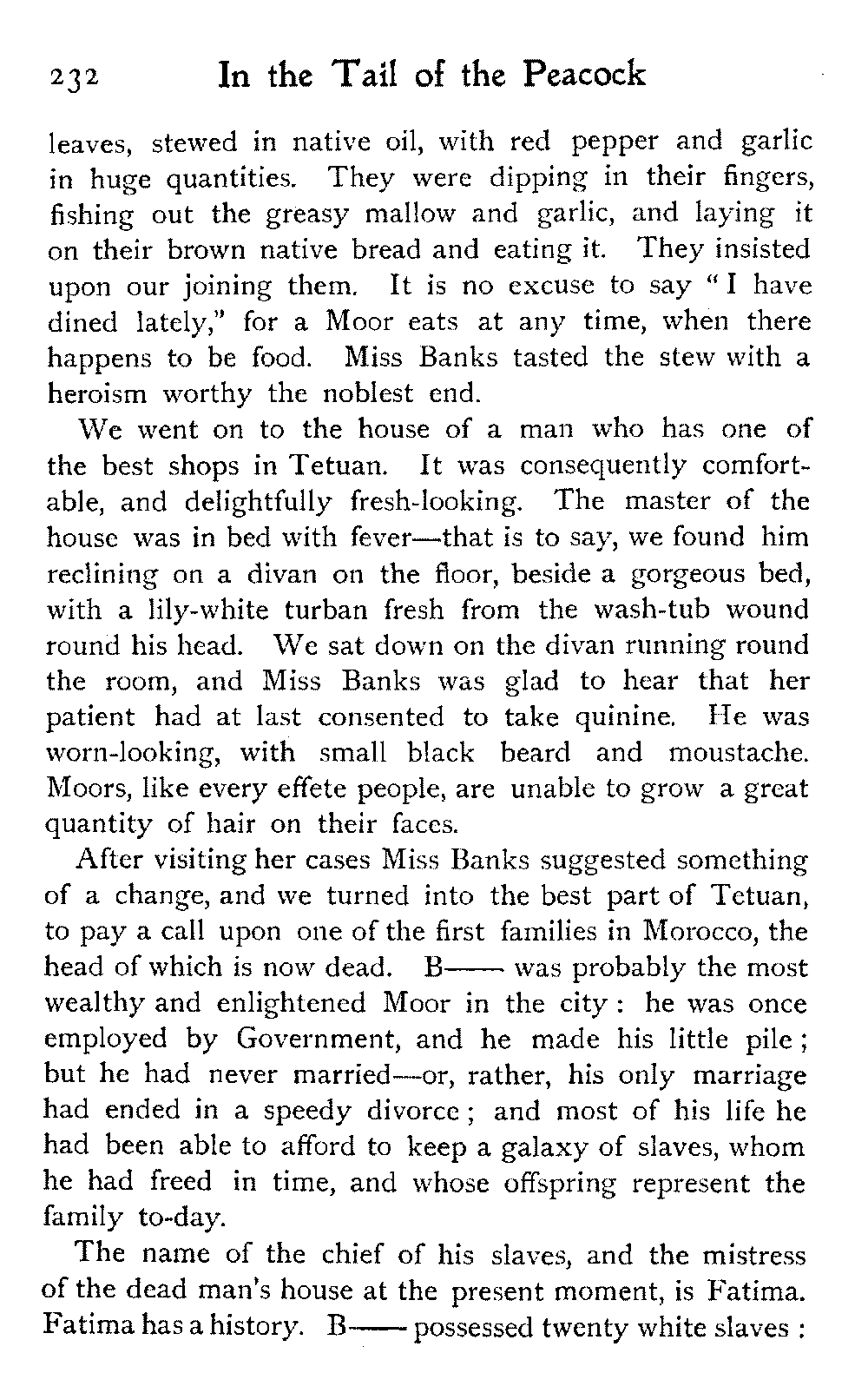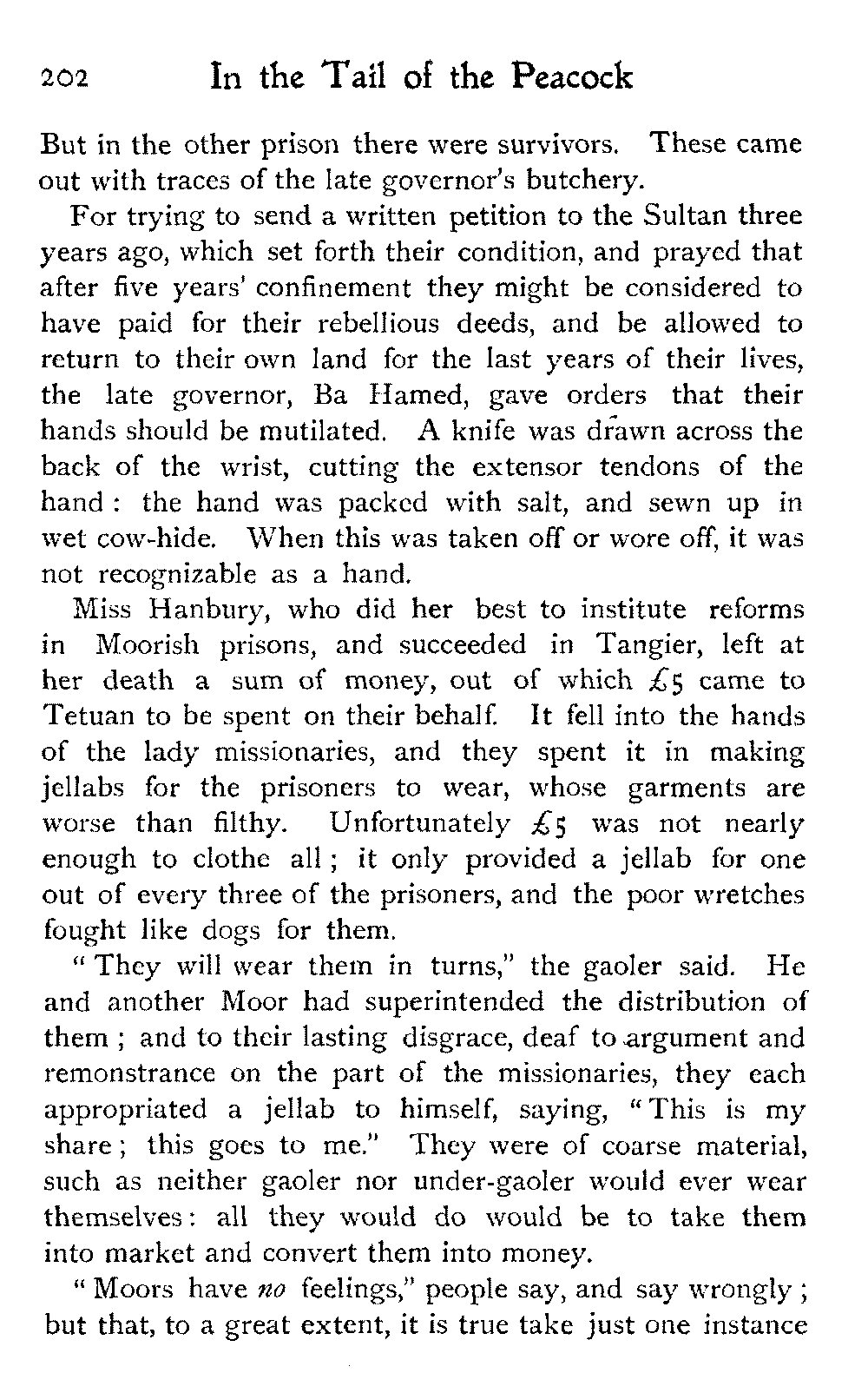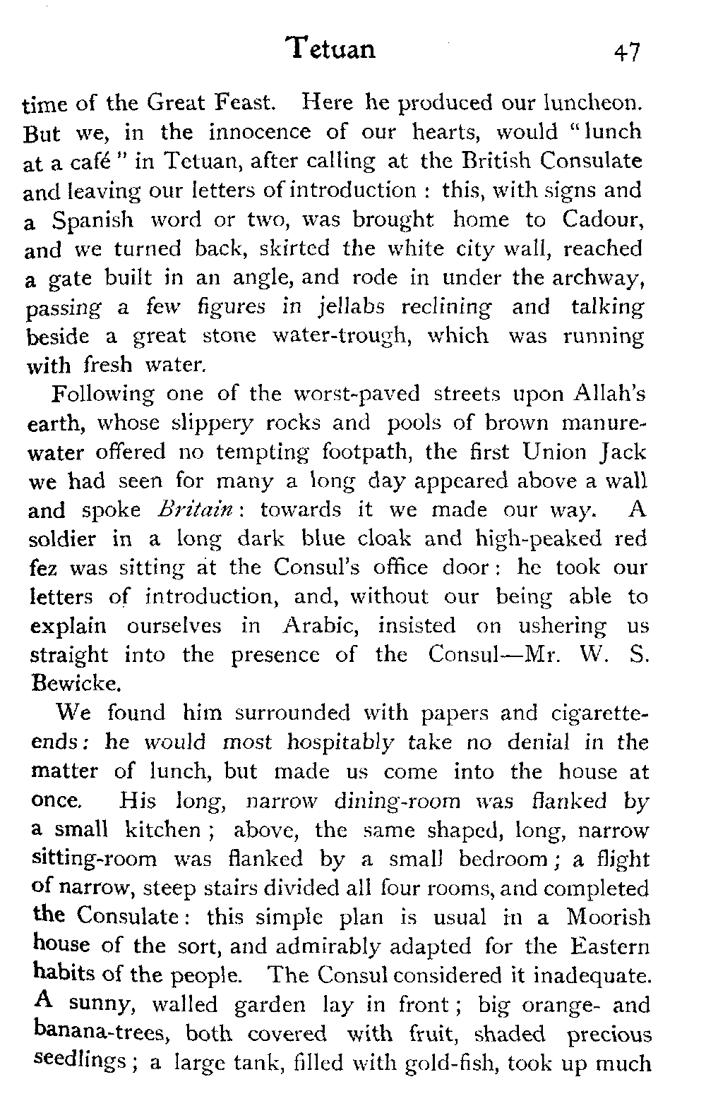To return to Ben Dowd. He was "detained" in a house—not ignominiously committed to the common gaol, an unusual respite—allowed twelve shillings a day, and his wife's company. He was in Fez with these restrictions at the time we were looking over his gardens; and half of his wives were left behind at his own house, costing him a pound a day, we were told, in the face of which his allowance seemed inadequate.