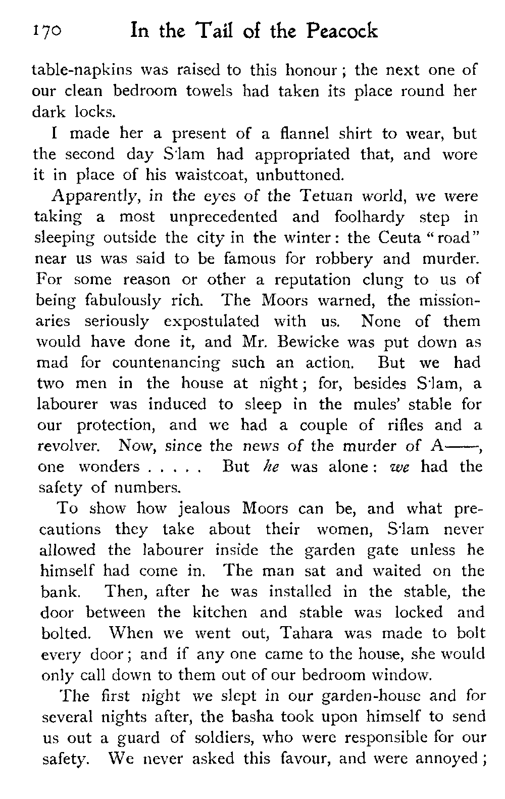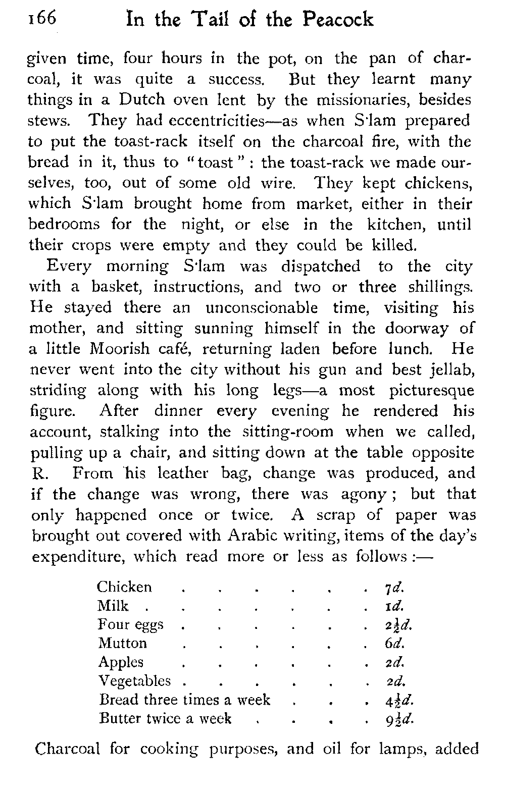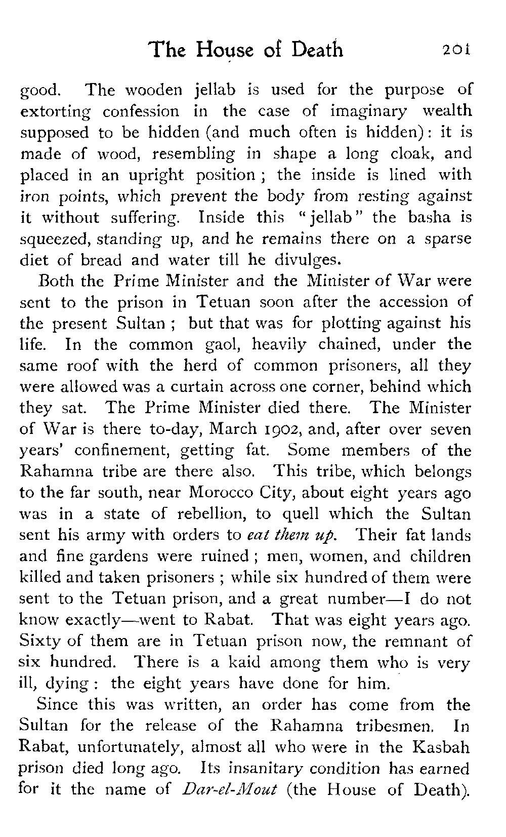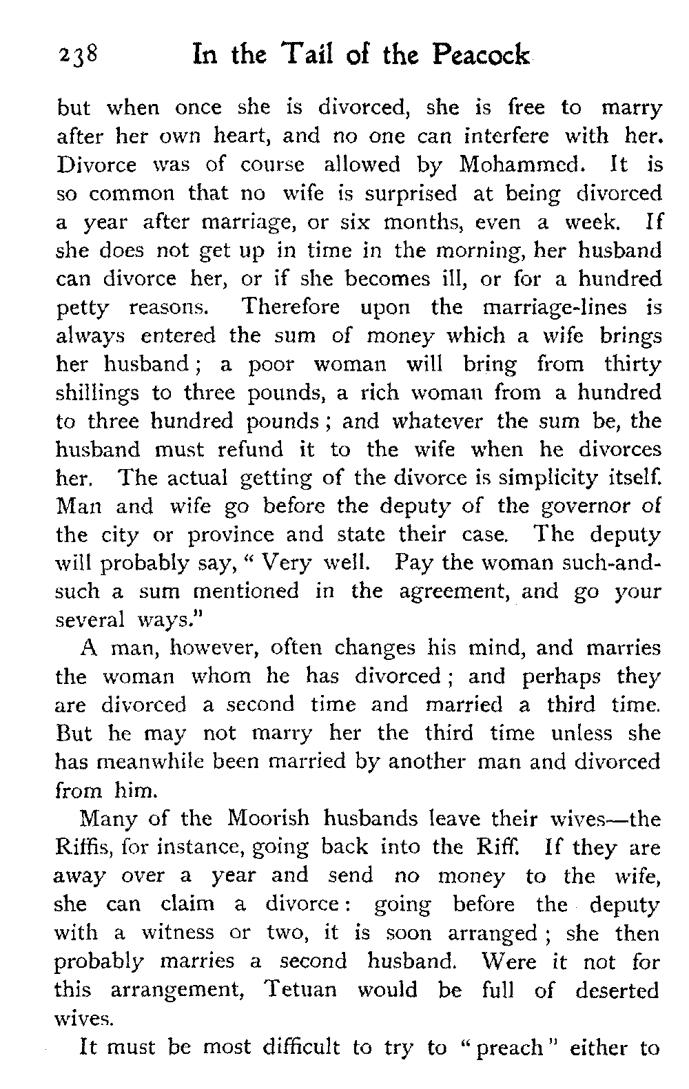 To return to Ben Dowd. He was "detained" in a house—not ignominiously committed to the common gaol, an unusual respite—allowed twelve shillings a day, and his wife's company. He was in Fez with these restrictions at the time we were looking over his gardens; and half of his wives were left behind at his own house, costing him a pound a day, we were told, in the face of which his allowance seemed inadequate.