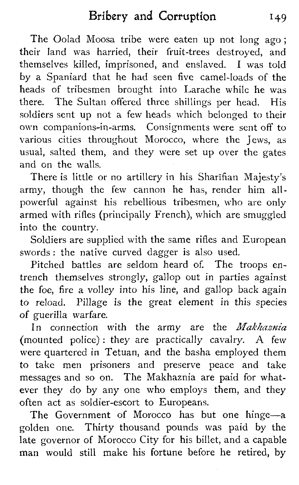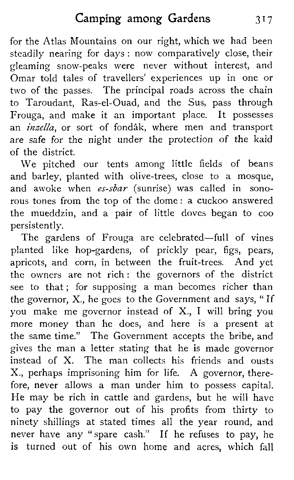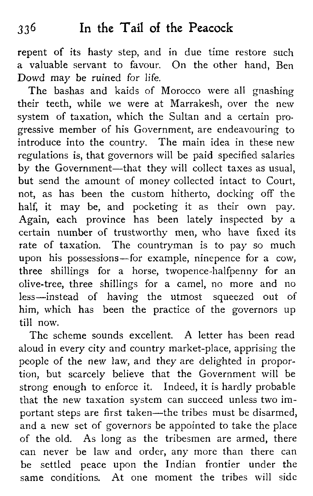 The bashas and kaids of Morocco were all gnashing their teeth, while we were at Marrakesh, over the new system of taxation, which the Sultan and a certain progressive member of his Government, are endeavouring to introduce into the country. The main idea in these new regulations is, that governors will be paid specified salaries by the Government—that they will collect taxes as usual, but send the amount of money collected intact to Court, not, as has been the custom hitherto, docking off the half, it may be, and pocketing it as their own pay. Again, each province has been lately inspected by a certain number of trustworthy men, who have fixed its rate of taxation. The countryman is to pay so much upon his possessions—for example, ninepence for a cow, three shillings for a horse, twopence-halfpenny for an olive-tree, three shillings for a camel, no more and no less—instead of having the utmost squeezed out of him, which has been the practice of the governors up till now.
