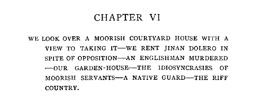 Chapter VI | We Look Over a Moorish Courtyard House with a View to Taking It—We Rent Jinan Dolero in Spite of Opposition—An Englishman Murdered—Our Garden-House—The Idiosyncrasies of Moorish Servants—A Native Guard—The Riff Country | 153 |