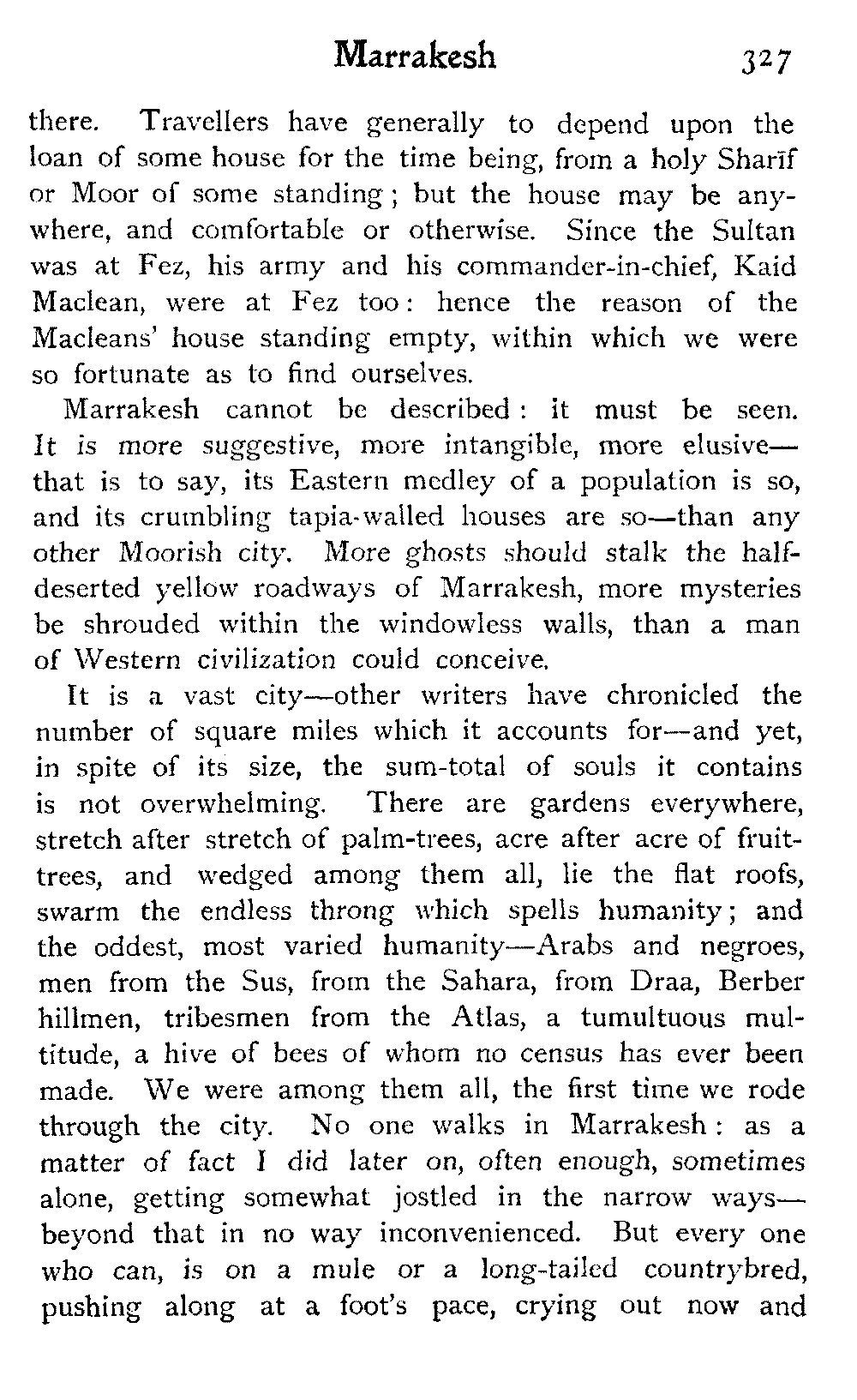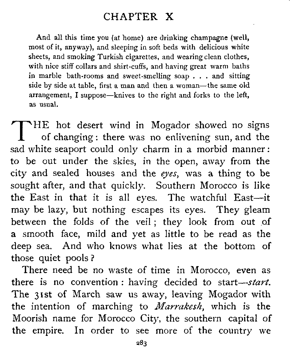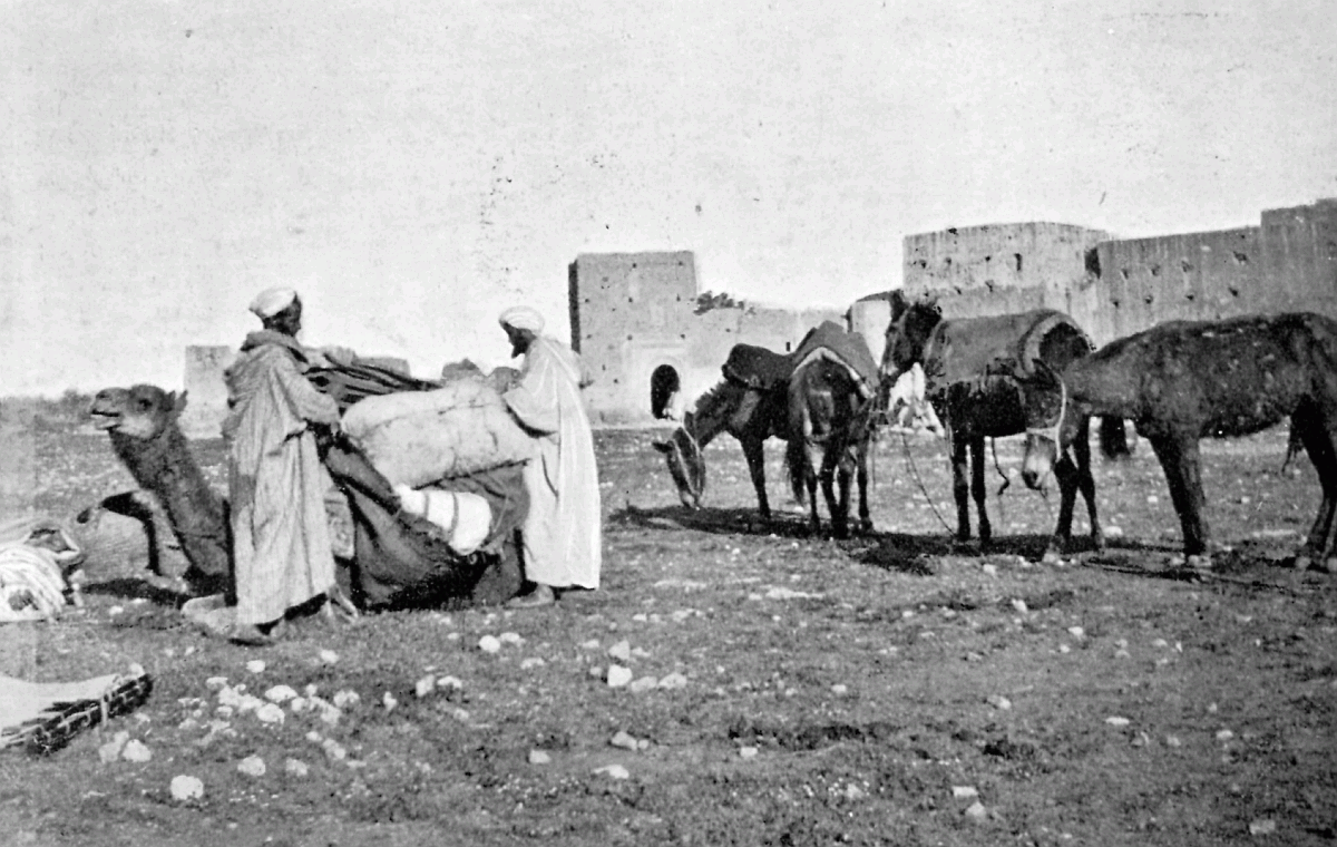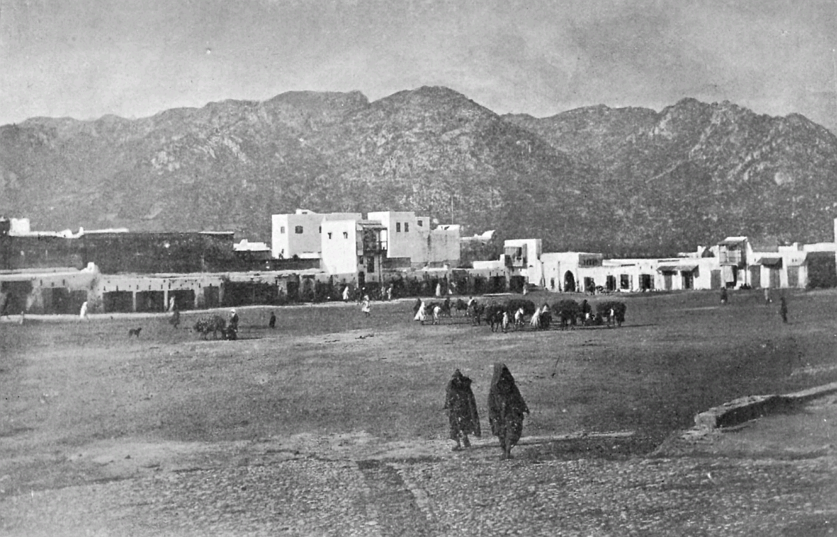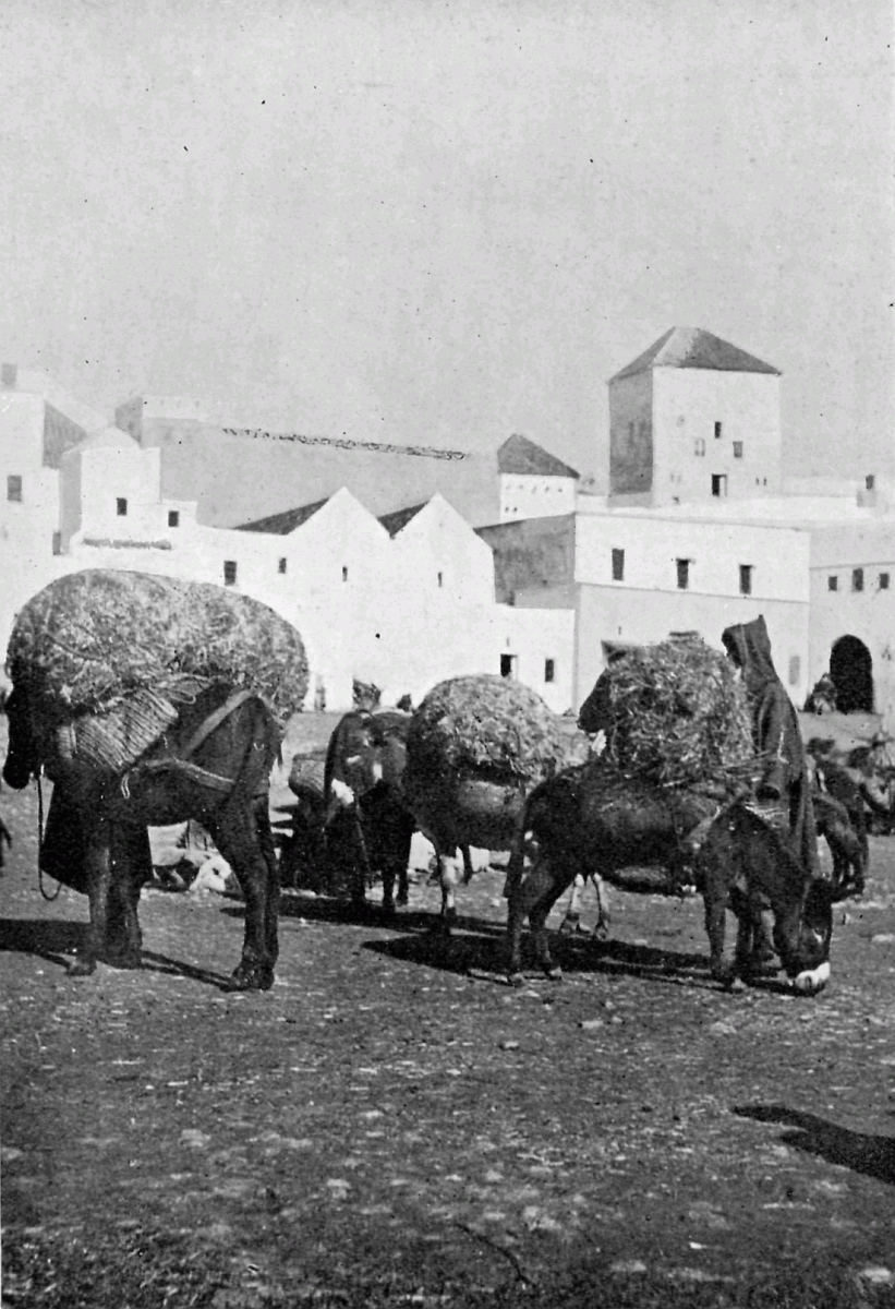 It is one of the few countries in the world, and they grow fewer each year, which is still unexplored—unknown. Thousands of square miles in Morocco have never been crossed by a European, or at any rate none have returned to tell the tale: maps mark only blank spaces, and have no names for villages, no records of mountains or rivers: there are no roads, still less railways, in the country: the only means of transport along the wild, worn tracks is by camels, mules, and donkeys: he who will not ride perforce walks.