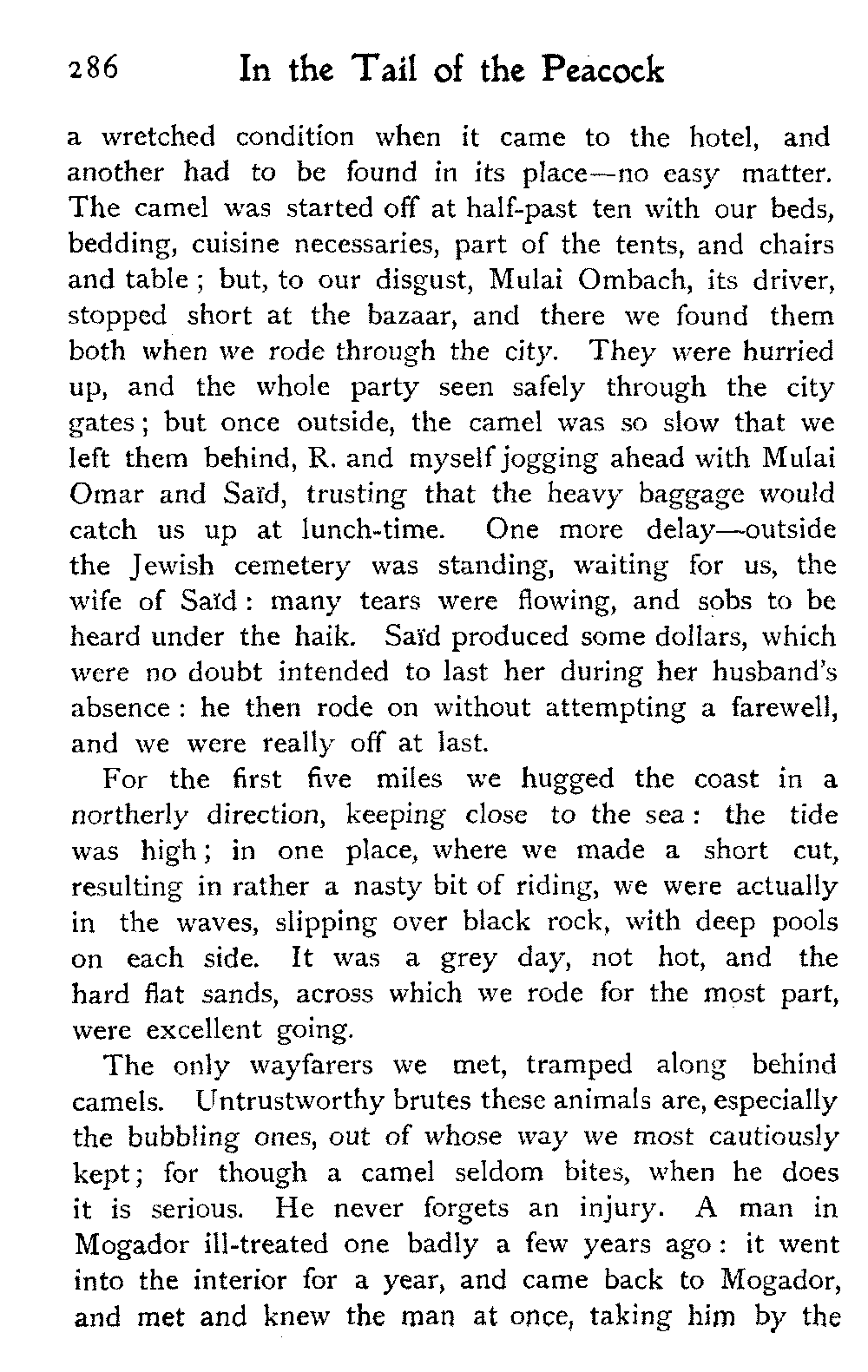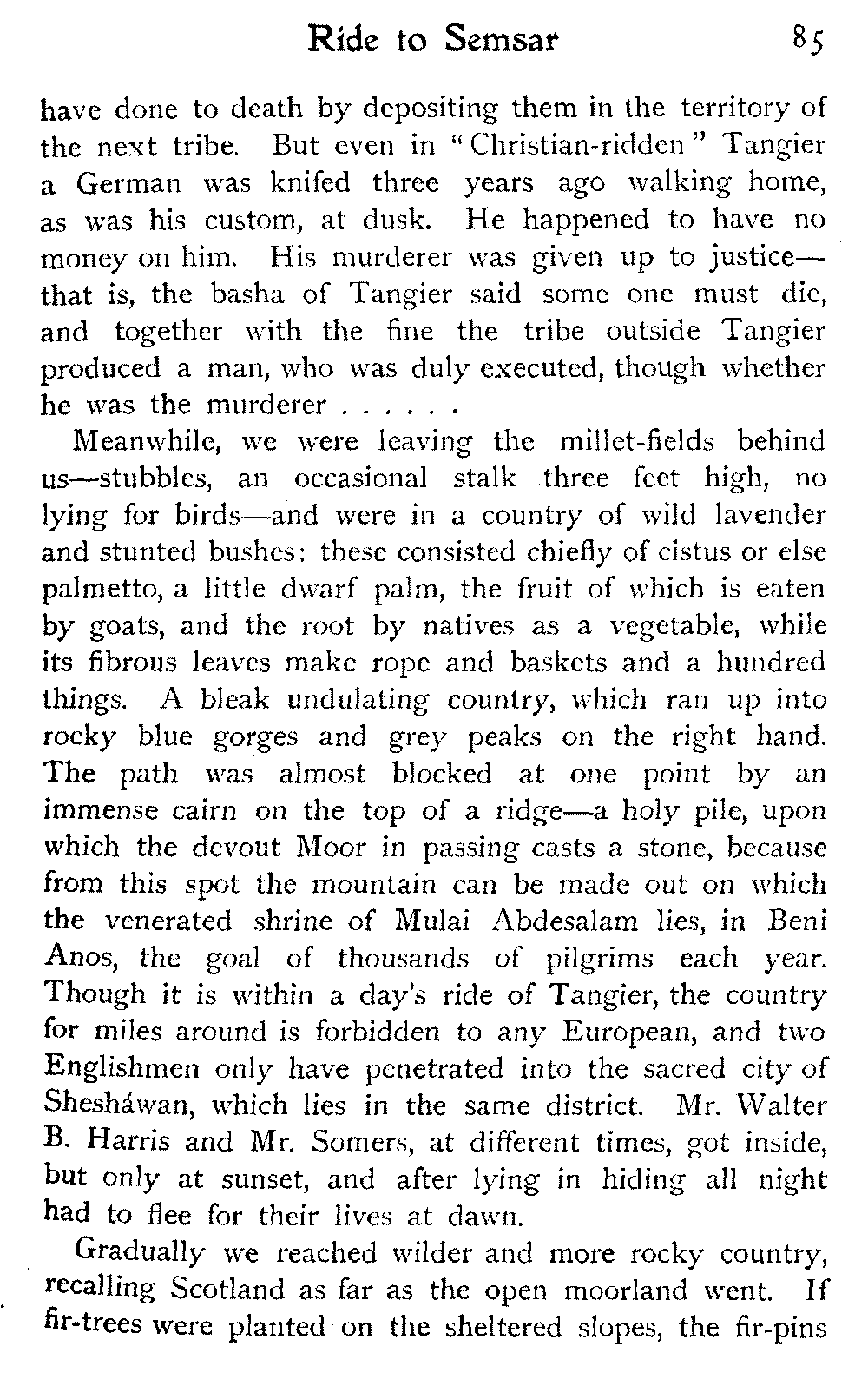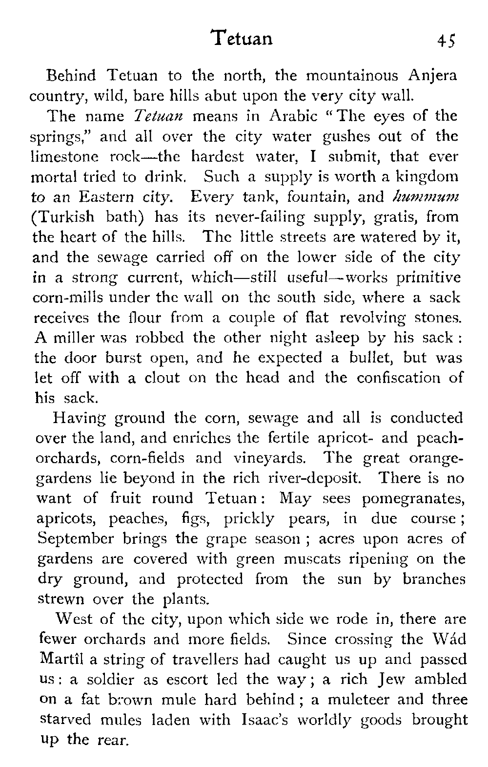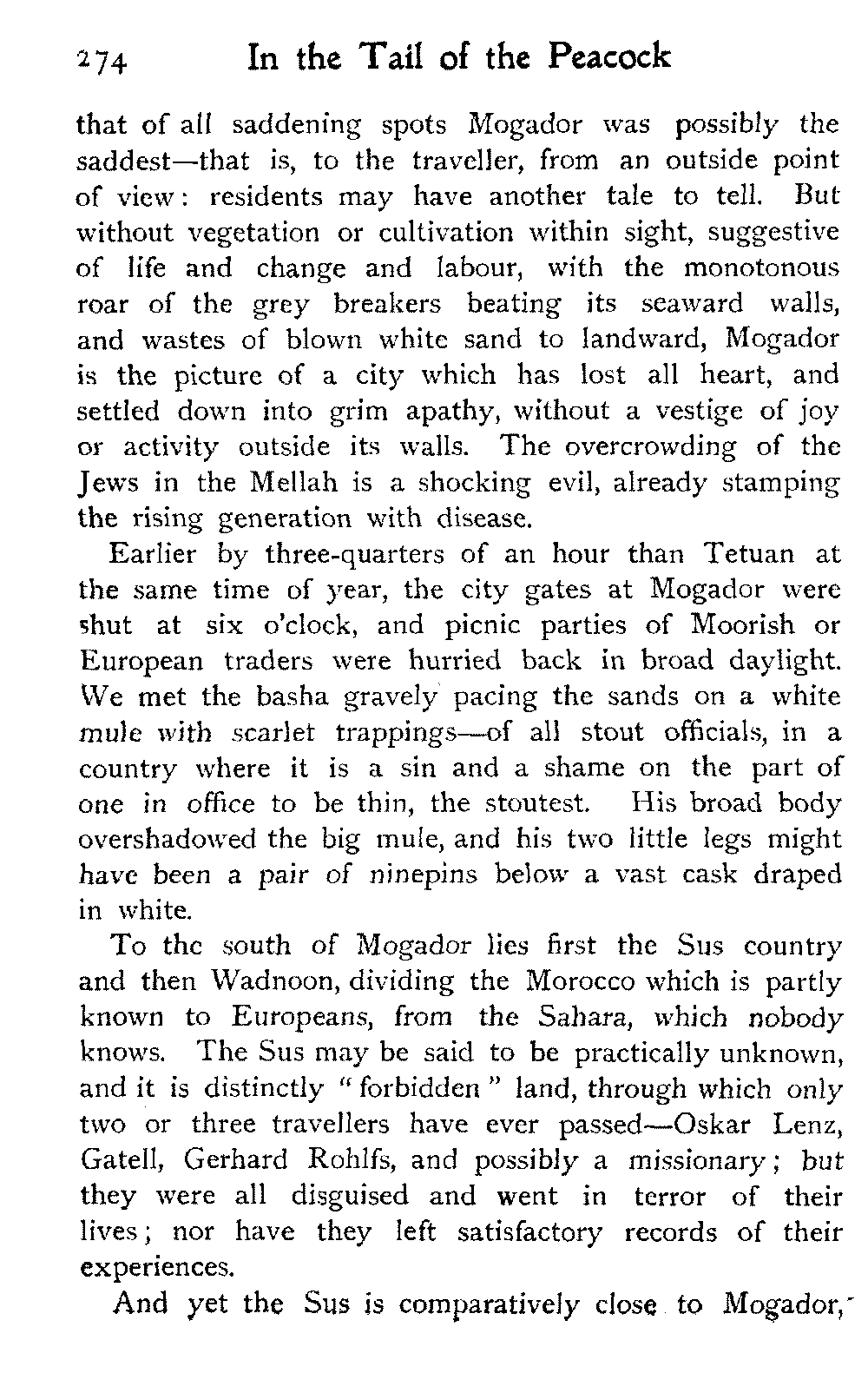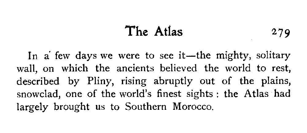 It is one of the few countries in the world, and they grow fewer each year, which is still unexplored—unknown. Thousands of square miles in Morocco have never been crossed by a European, or at any rate none have returned to tell the tale: maps mark only blank spaces, and have no names for villages, no records of mountains or rivers: there are no roads, still less railways, in the country: the only means of transport along the wild, worn tracks is by camels, mules, and donkeys: he who will not ride perforce walks.