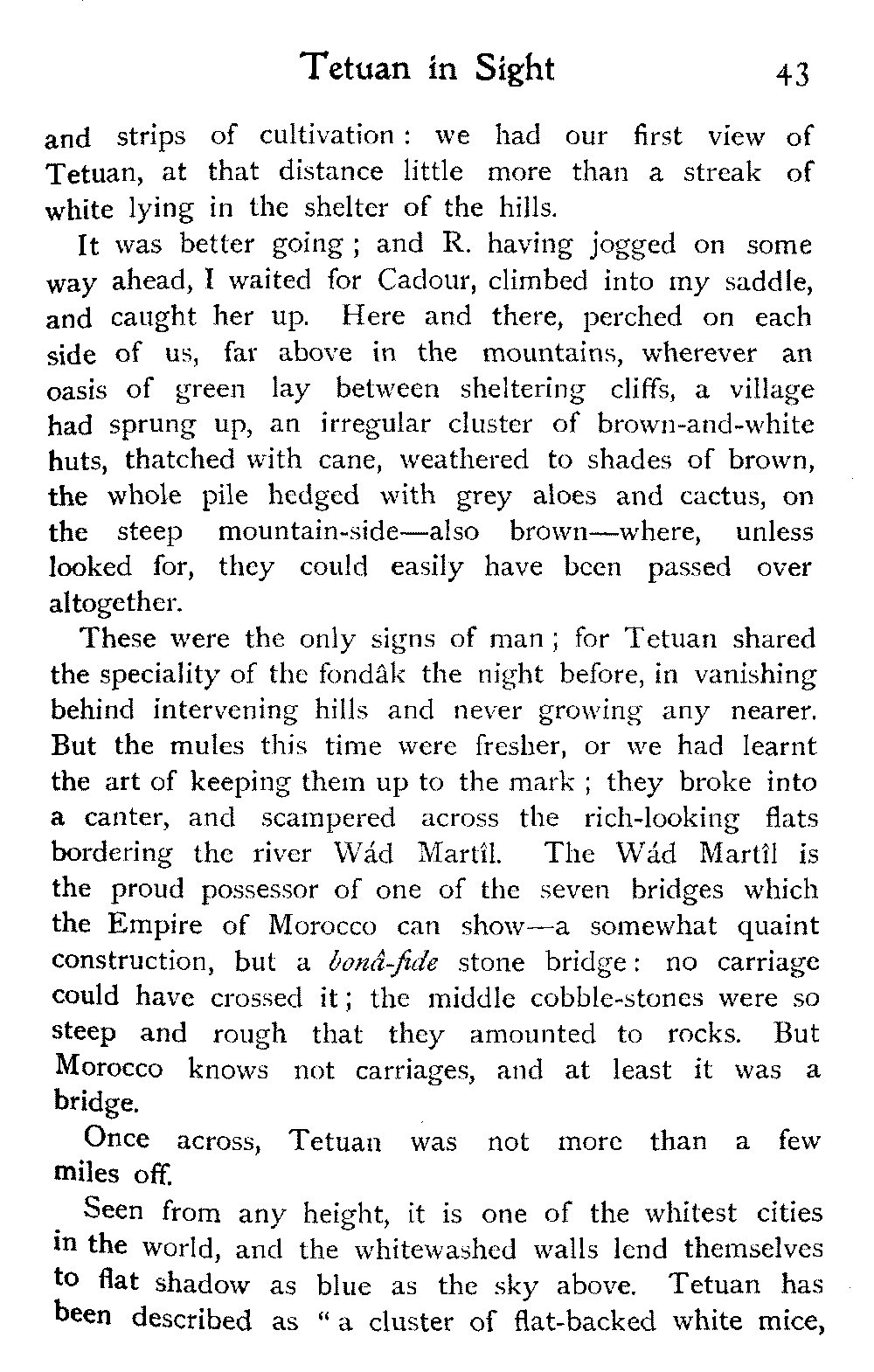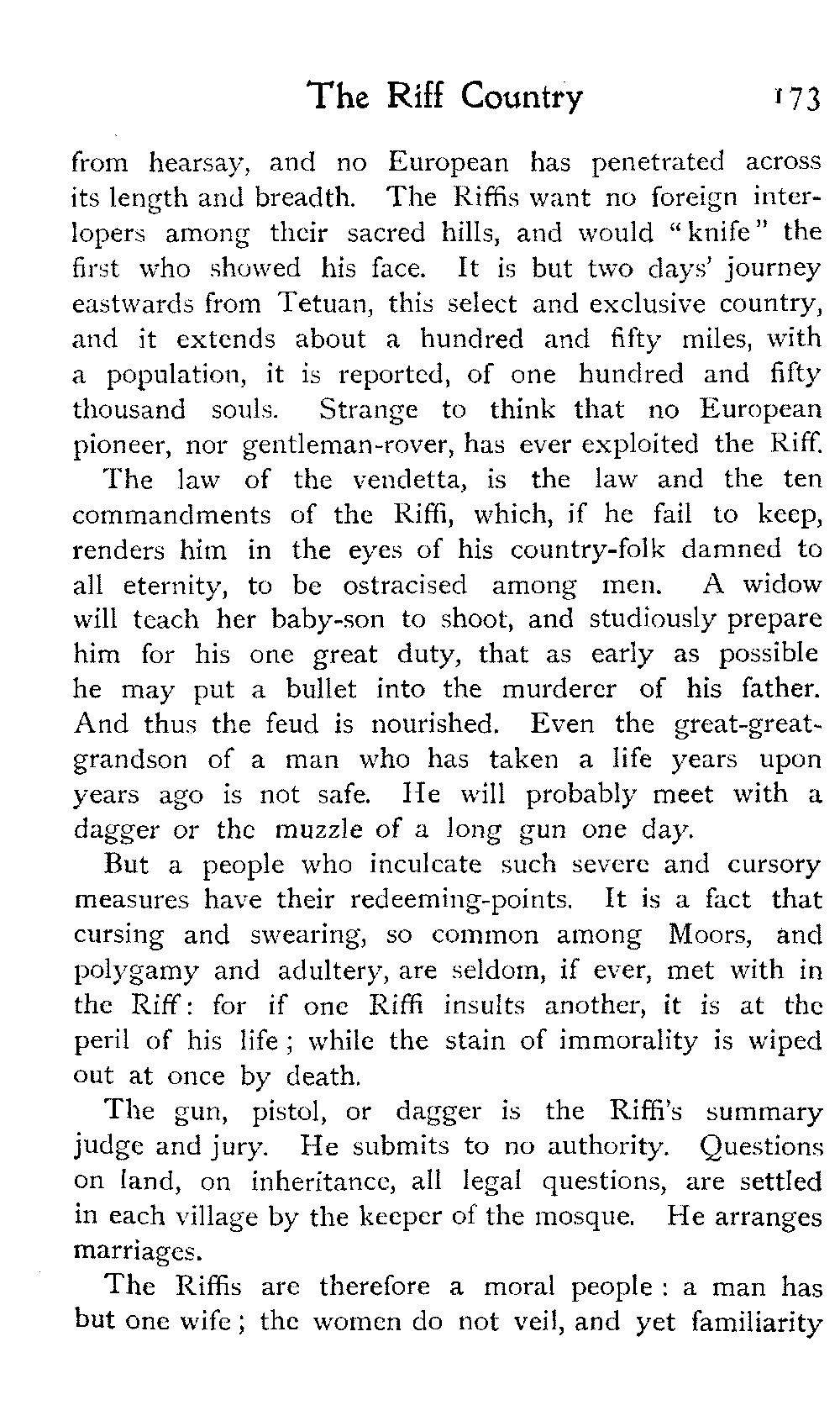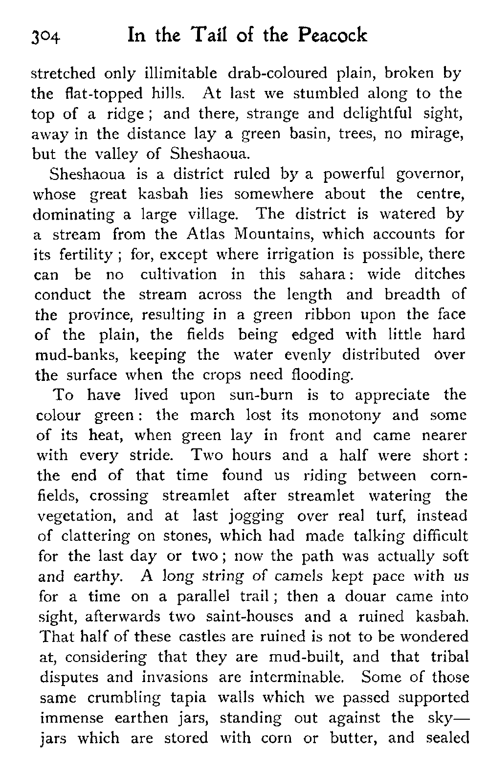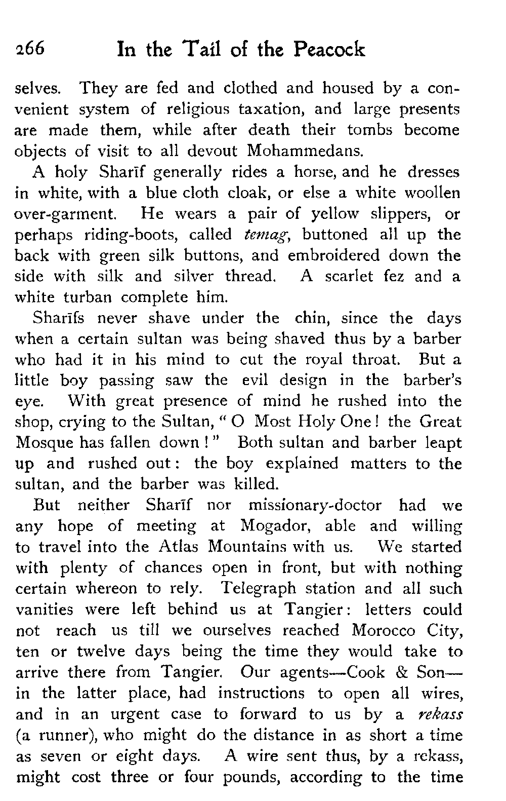 It is one of the few countries in the world, and they grow fewer each year, which is still unexplored—unknown. Thousands of square miles in Morocco have never been crossed by a European, or at any rate none have returned to tell the tale: maps mark only blank spaces, and have no names for villages, no records of mountains or rivers: there are no roads, still less railways, in the country: the only means of transport along the wild, worn tracks is by camels, mules, and donkeys: he who will not ride perforce walks.