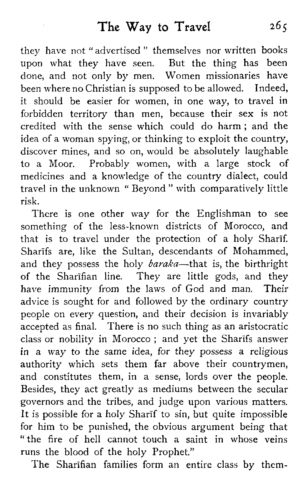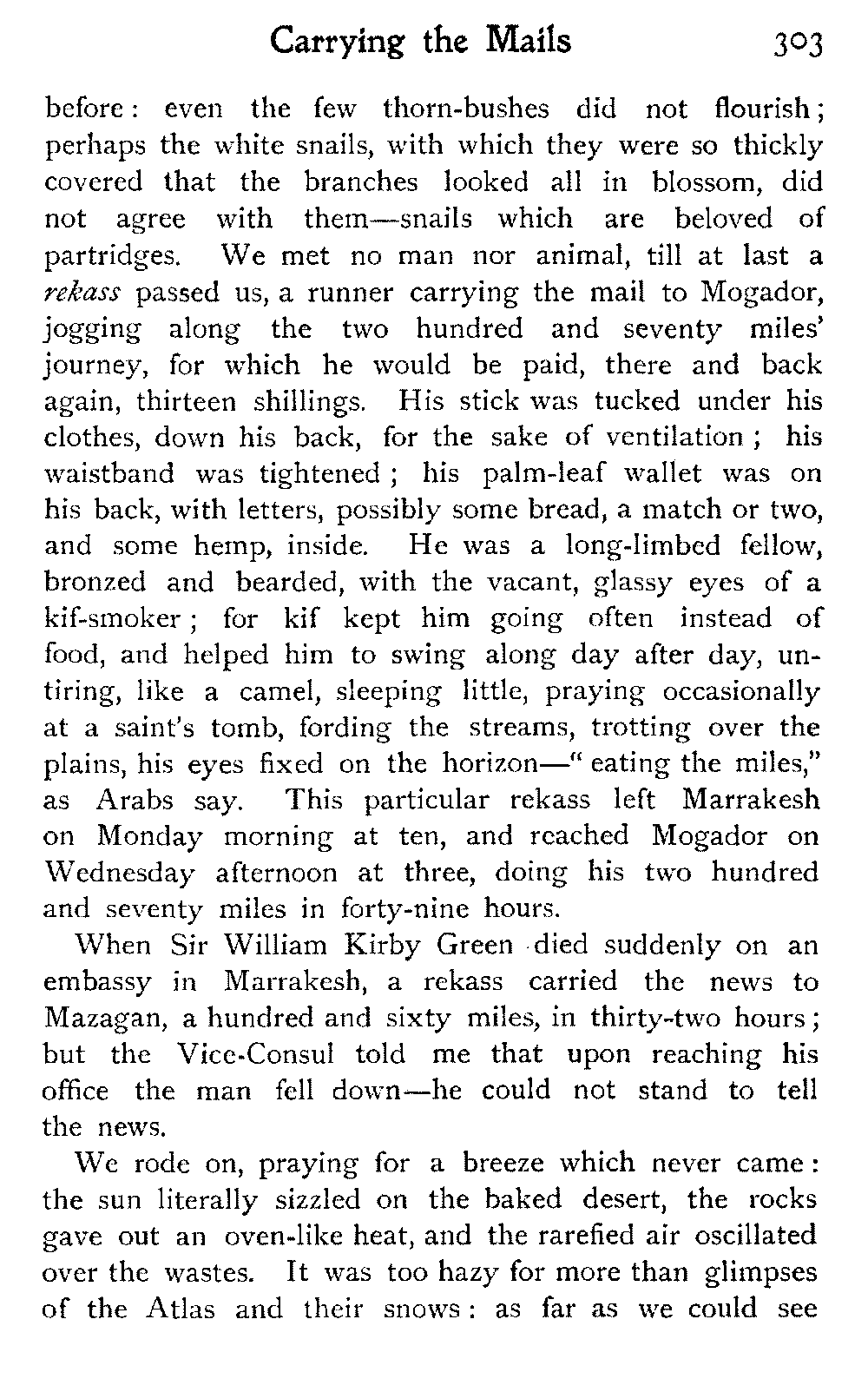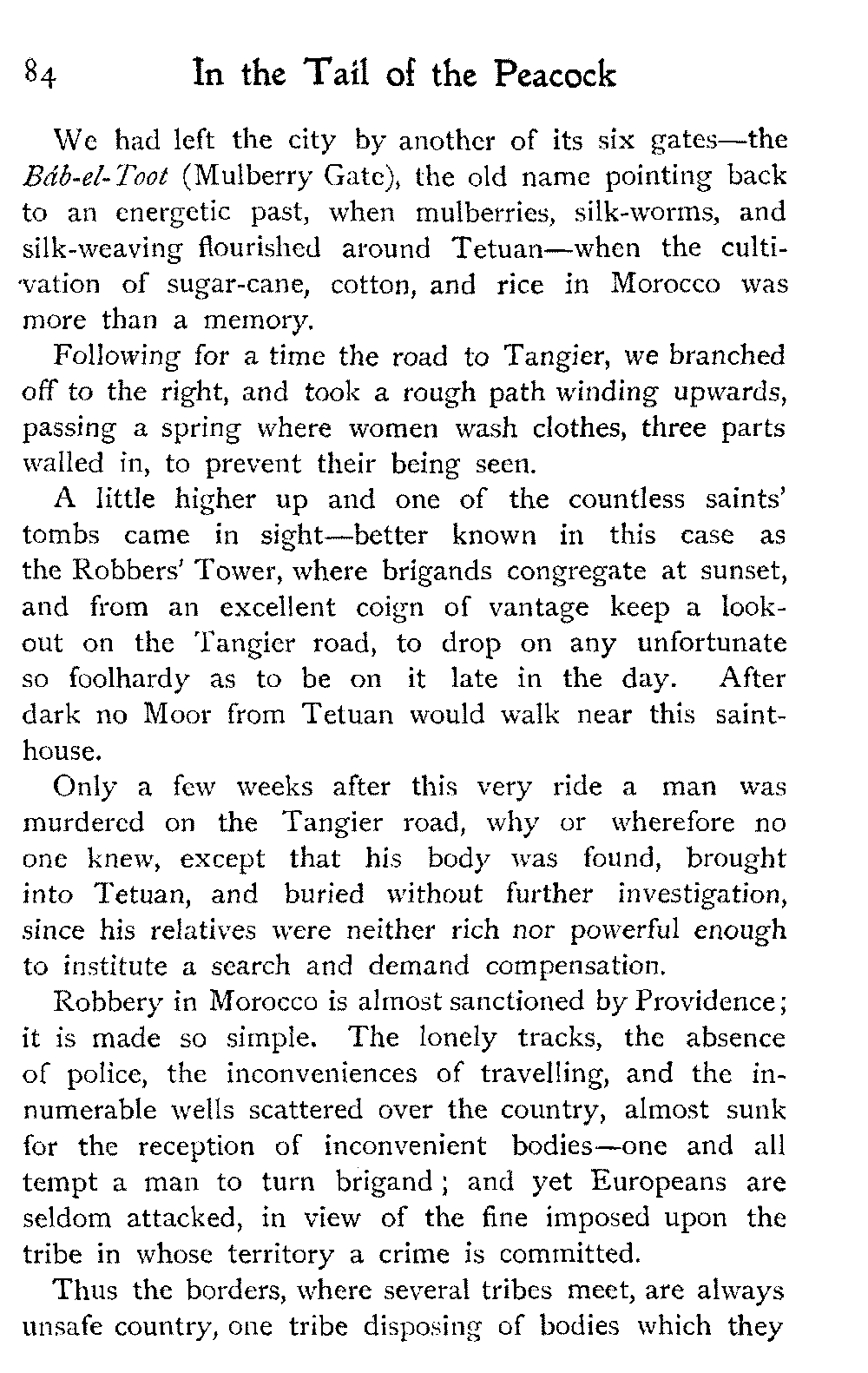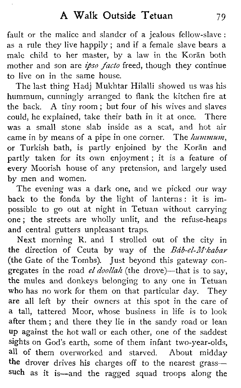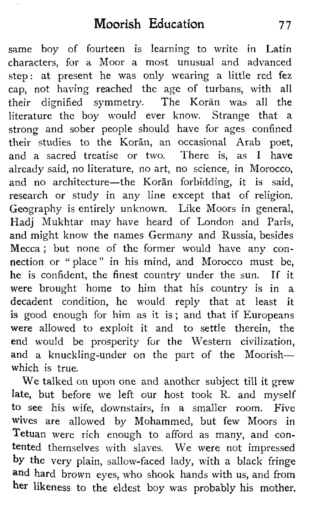 It is one of the few countries in the world, and they grow fewer each year, which is still unexplored—unknown. Thousands of square miles in Morocco have never been crossed by a European, or at any rate none have returned to tell the tale: maps mark only blank spaces, and have no names for villages, no records of mountains or rivers: there are no roads, still less railways, in the country: the only means of transport along the wild, worn tracks is by camels, mules, and donkeys: he who will not ride perforce walks.