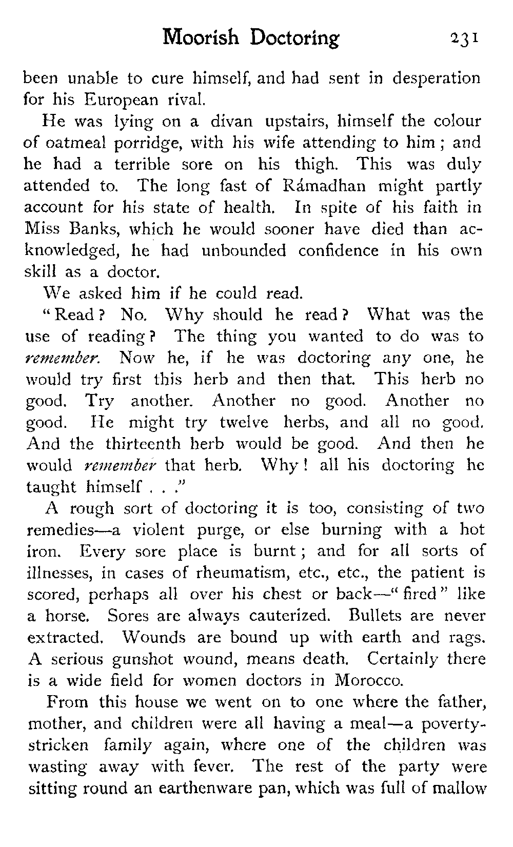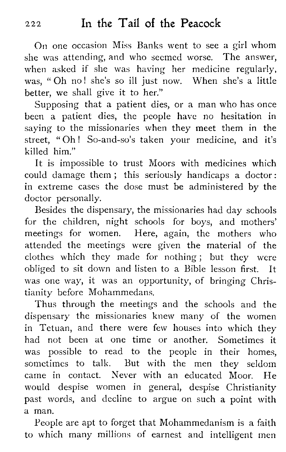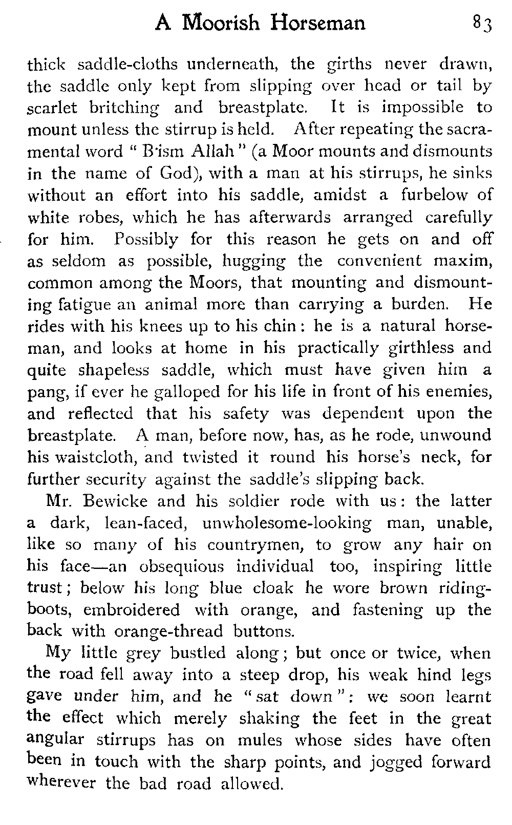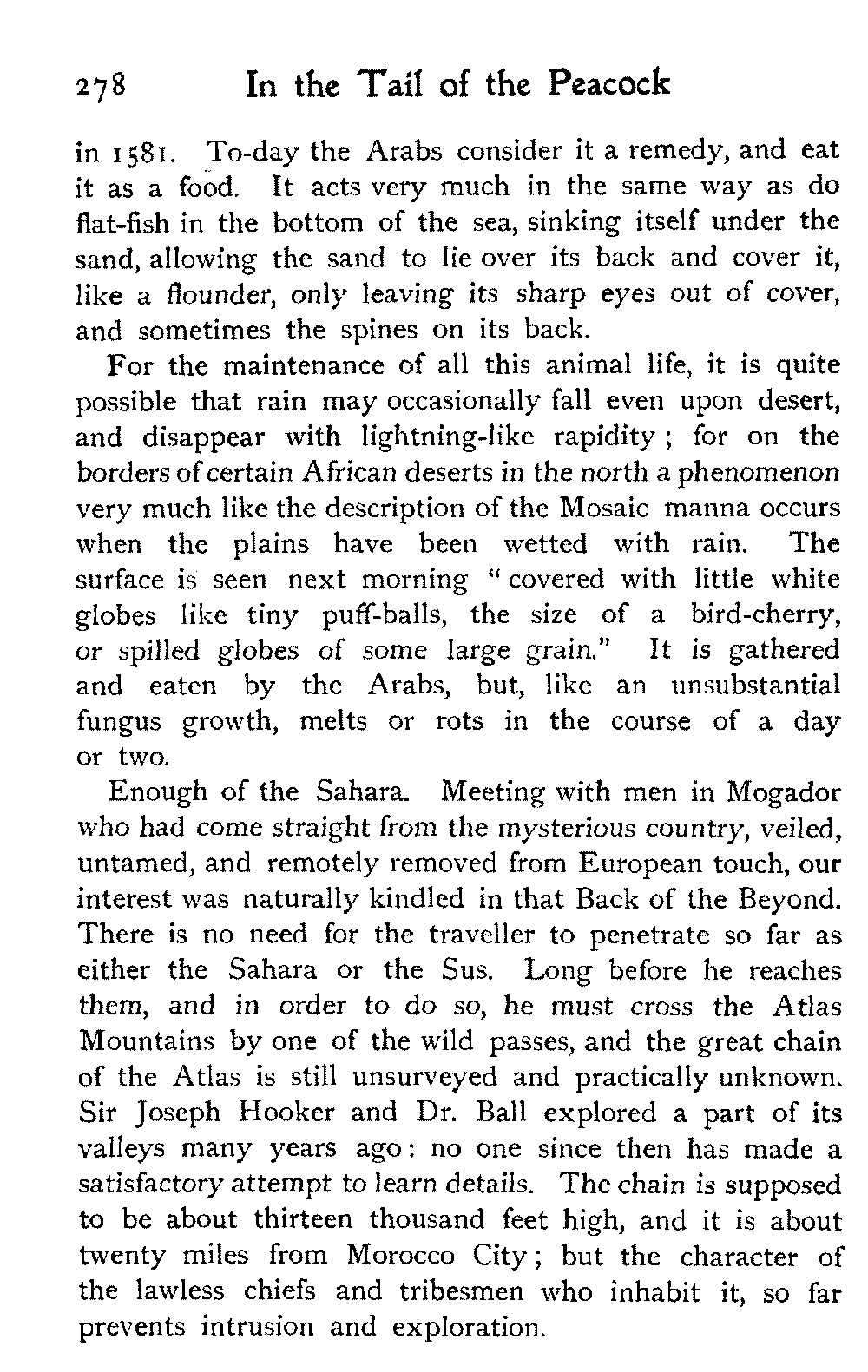 It is one of the few countries in the world, and they grow fewer each year, which is still unexplored—unknown. Thousands of square miles in Morocco have never been crossed by a European, or at any rate none have returned to tell the tale: maps mark only blank spaces, and have no names for villages, no records of mountains or rivers: there are no roads, still less railways, in the country: the only means of transport along the wild, worn tracks is by camels, mules, and donkeys: he who will not ride perforce walks.