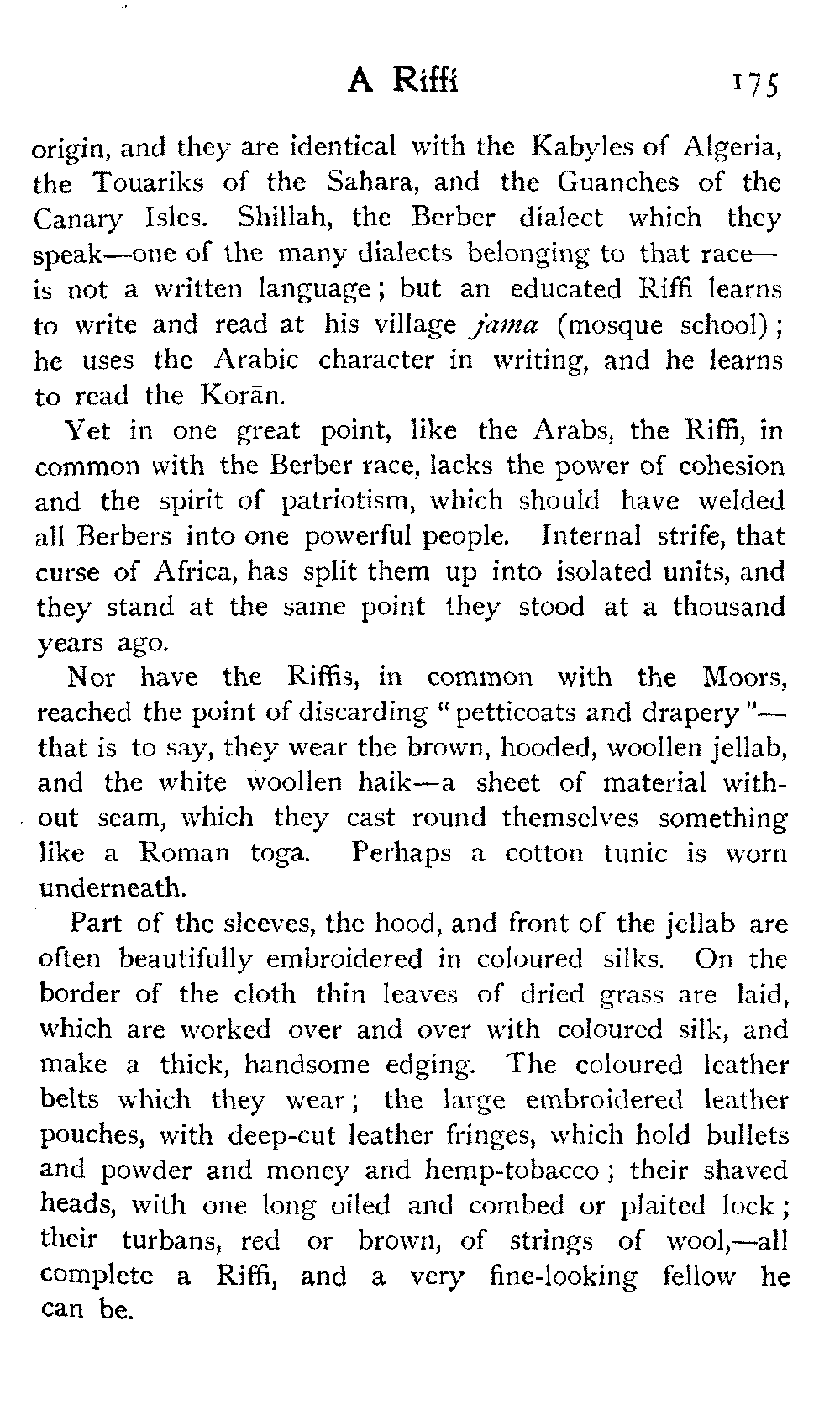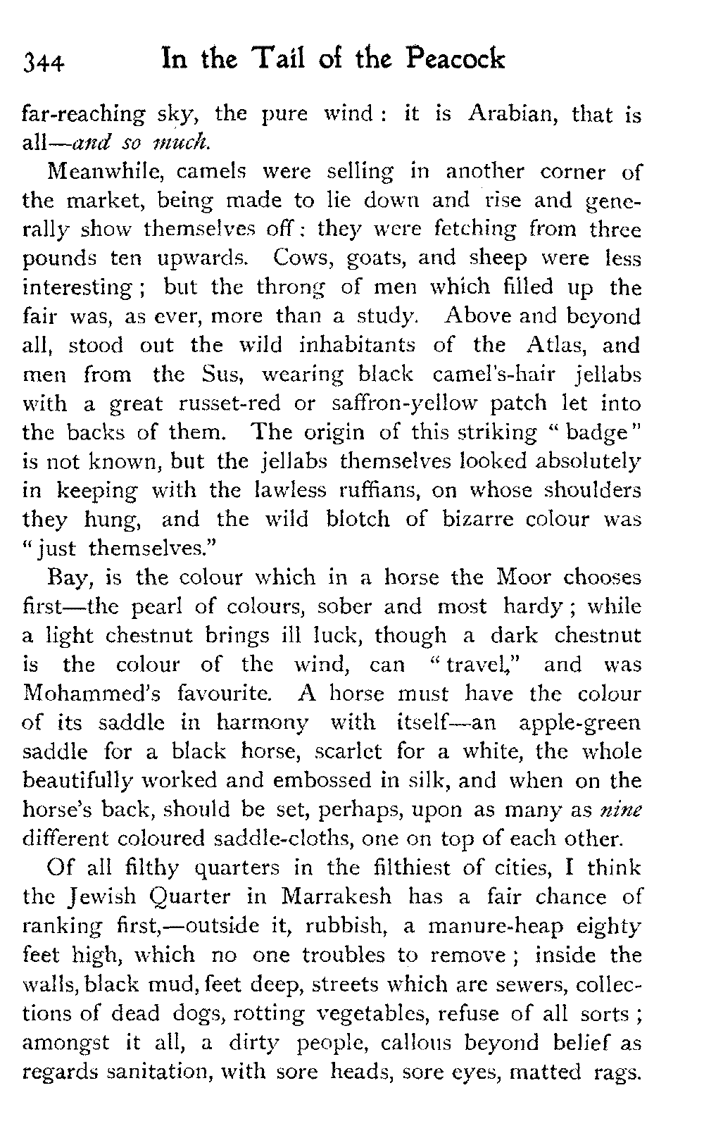 Meanwhile, camels were selling in another corner of the market, being made to lie down and rise and generally show themselves off: they were fetching from three pounds ten upwards. Cows, goats, and sheep were less interesting; but the throng of men which filled up the fair was, as ever, more than a study. Above and beyond all, stood out the wild inhabitants of the Atlas, and men from the Sus, wearing black camel's-hair jellabs with a great russet-red or saffron-yellow patch let into the backs of them. The origin of this striking "badge" is not known, but the jellabs themselves looked absolutely in keeping with the lawless ruffians, on whose shoulders they hung, and the wild blotch of bizarre colour was "just themselves."