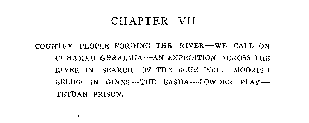 Chapter VII | Country People Fording the River—We Call on Ci Hamed Ghralmia—An Expedition across the River in Search of the Blue Pool—Moorish Belief in Ginns—The Basha—Powder Play—Tetuan Prison | 181 |