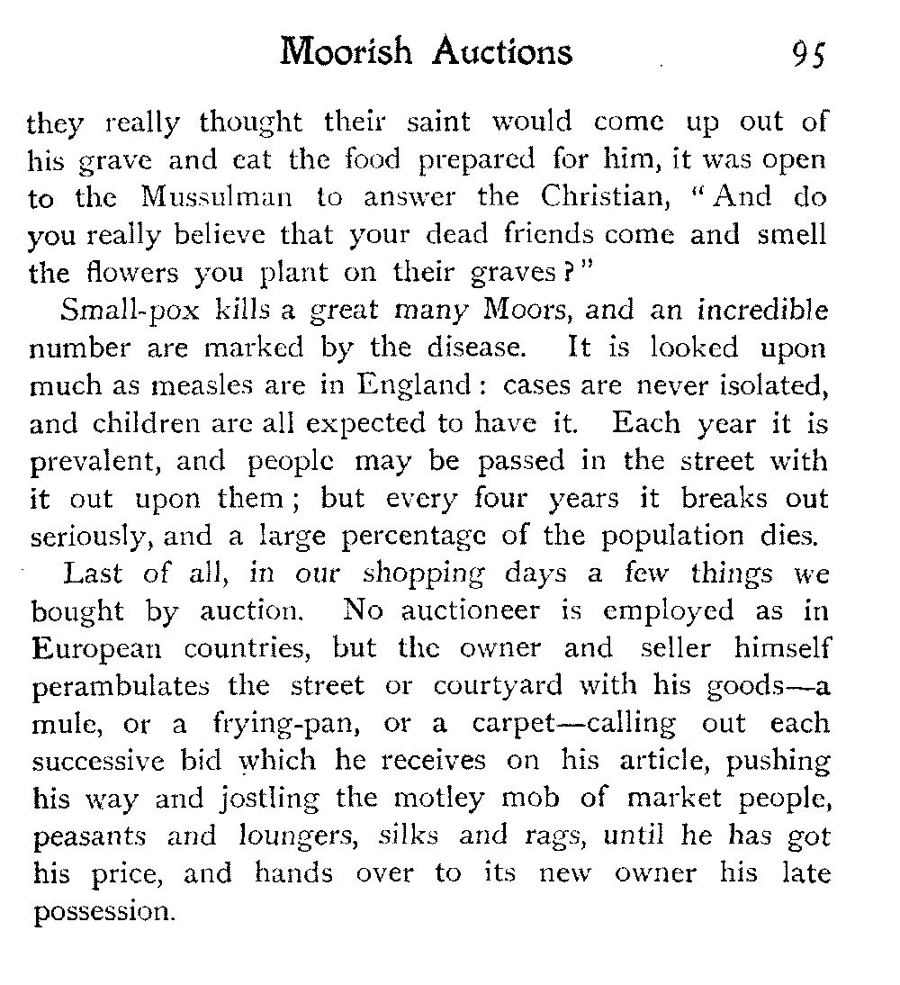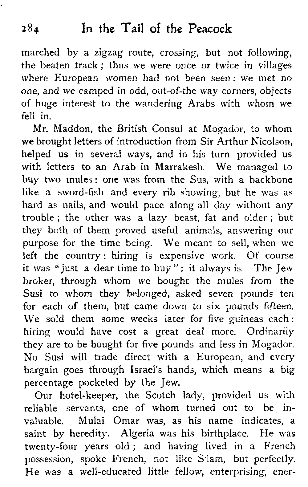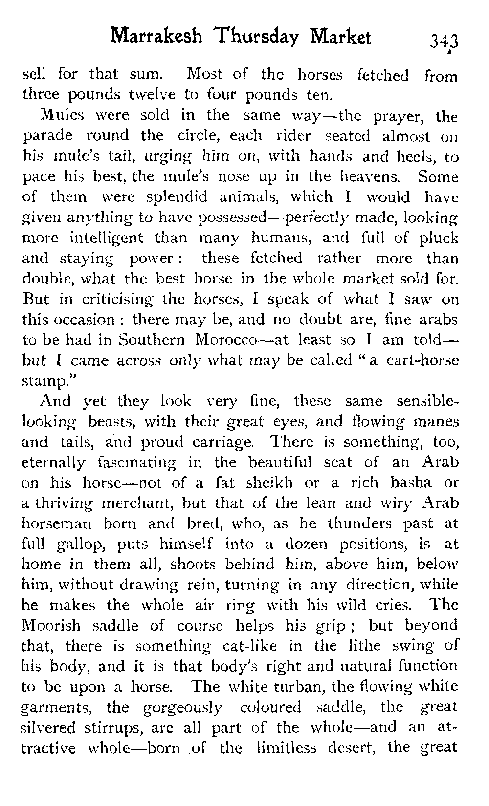 Mules were sold in the same way—the prayer, the parade round the circle, each rider seated almost on his mule's tail, urging him on, with hands and heels, to pace his best, the mule's nose up in the heavens. Some of them were splendid animals, which I would have given anything to have possessed—perfectly made, looking more intelligent than many humans, and full of pluck and staying power: these fetched rather more than double, what the best horse in the whole market sold for. But in criticising the horses, I speak of what I saw on this occasion: there may be, and no doubt are, fine arabs to be had in Southern Morocco—at least so I am told—but I came across only what may be called "a cart-horse stamp."