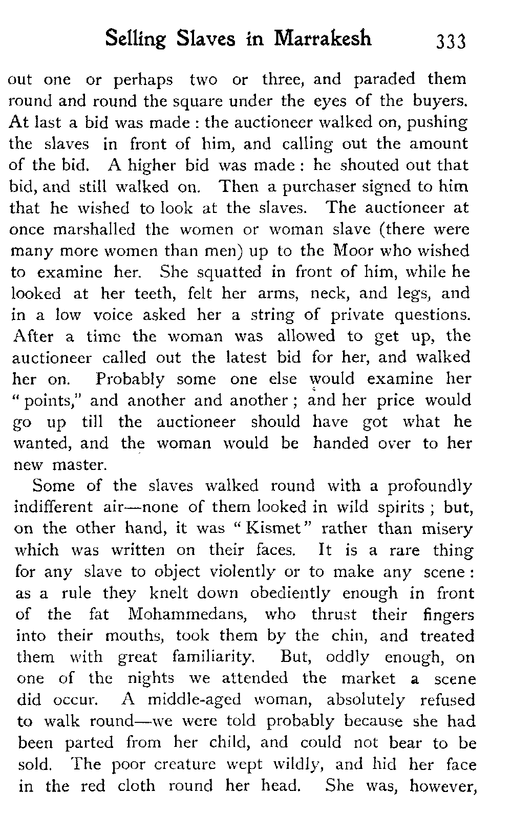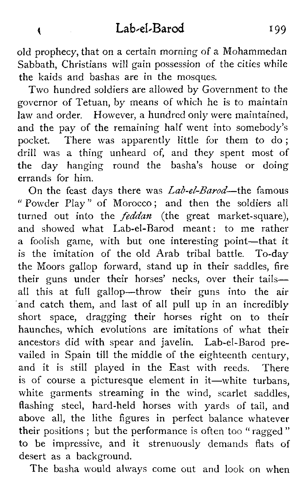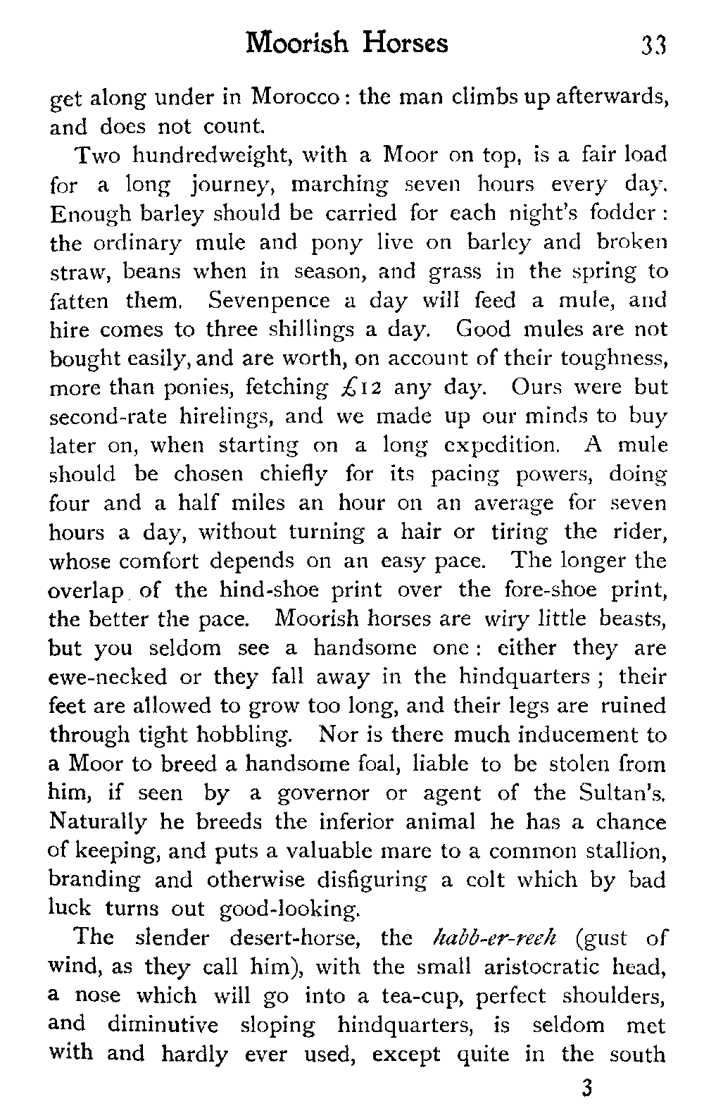 Mules were sold in the same way—the prayer, the parade round the circle, each rider seated almost on his mule's tail, urging him on, with hands and heels, to pace his best, the mule's nose up in the heavens. Some of them were splendid animals, which I would have given anything to have possessed—perfectly made, looking more intelligent than many humans, and full of pluck and staying power: these fetched rather more than double, what the best horse in the whole market sold for. But in criticising the horses, I speak of what I saw on this occasion: there may be, and no doubt are, fine arabs to be had in Southern Morocco—at least so I am told—but I came across only what may be called "a cart-horse stamp."