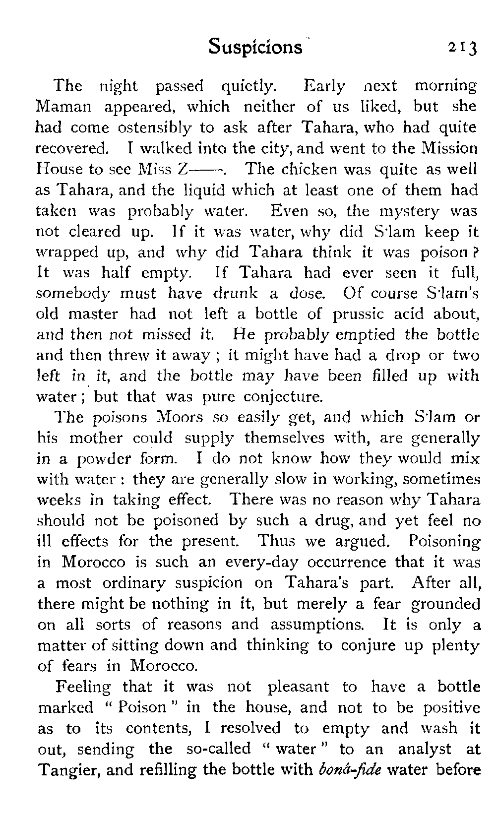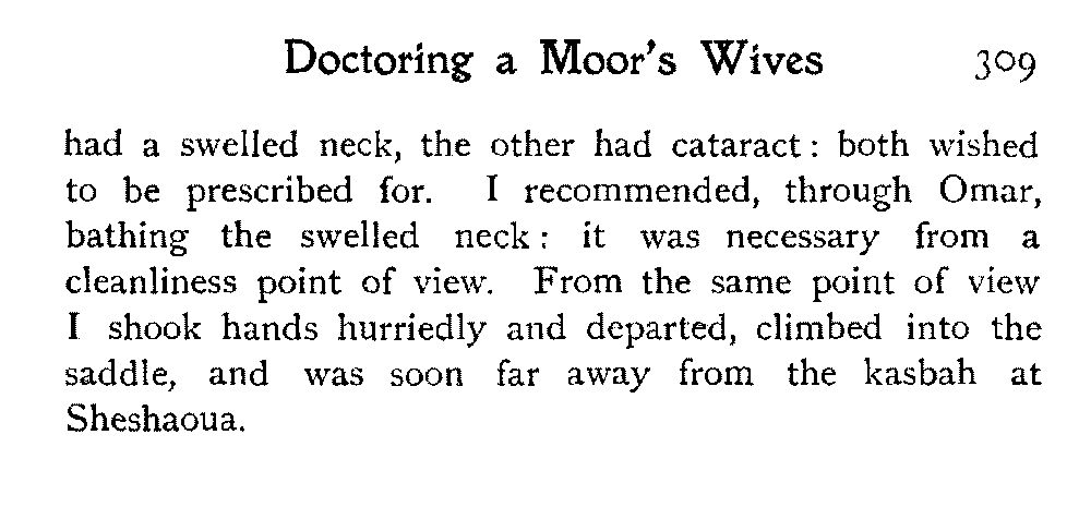 The ride to Glaouia might take five or six days: there were several other places and a district or two which would have been worth visiting ten times over. The missionaries in Marrakesh were willing to make all arrangements: one of them would have gone with us, and under that escort it would have been possible to travel into the Atlas without risk. We should have gone "privately," without troubling any one, without formality; and in all probability no one would have troubled about us: that, after all, is the only way to travel satisfactorily in Morocco, not with half a dozen soldiers and a vast noise.