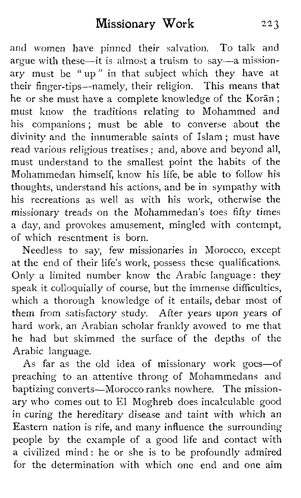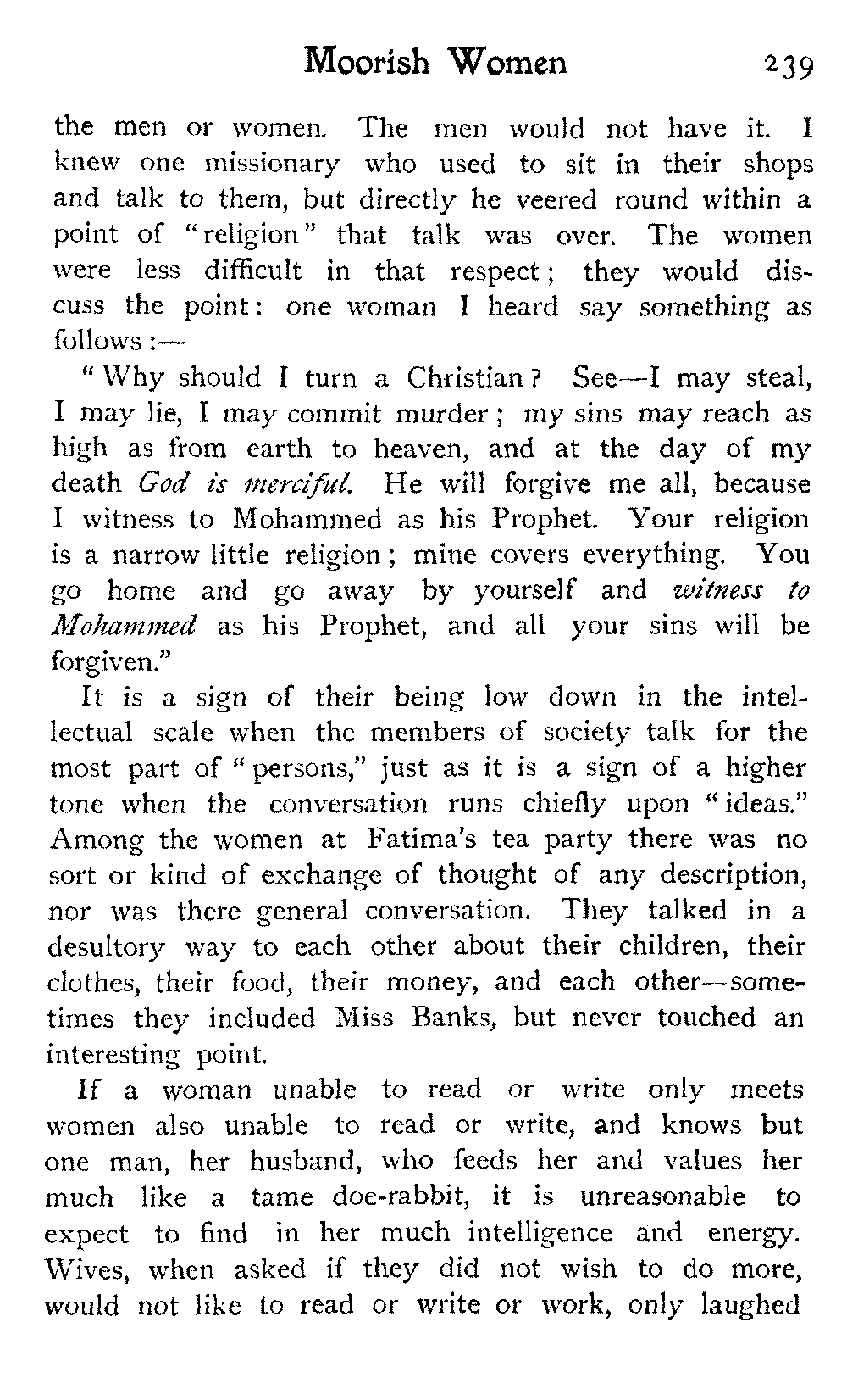 Its remote removal from all appertaining to the twentieth century, its strangely simple, untaught life, the solemn, stately men, the veiled women and their eyes, the steely blue cactus, the white cities and the glaring light, the mystery and the fatalism which intensify the air, are alike oddly inevitable and incomprehensible to a European. The other side of the closed door has always constituted, for the wandering vagrants among mankind, their hearts' desire. For them there is still Morocco; and the door will be shut in their faces again and again by a people and a faith and customs which they can never understand. And though it be useless they will still go on, because it seems the best thing.
