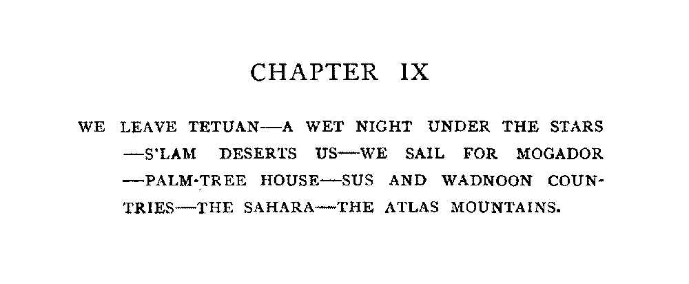 Chapter IX | We Leave Tetuan—A Wet Night under the Stars—S`lam Deserts Us—We Sail for Mogador—The Palm-Tree House—Sus and Wadnoon Countries—The Sahara—The Atlas Mountains | 249 |