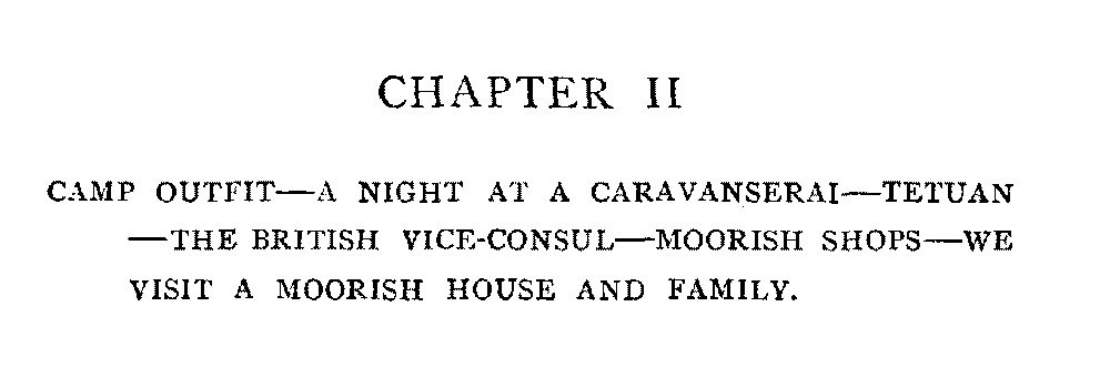 Chapter II | Camp Outfit—A Night at a Caravanserai—Tetuan—The British Vice-Consul—Moorish Shops—We Visit a Moorish House and Family | 27 |