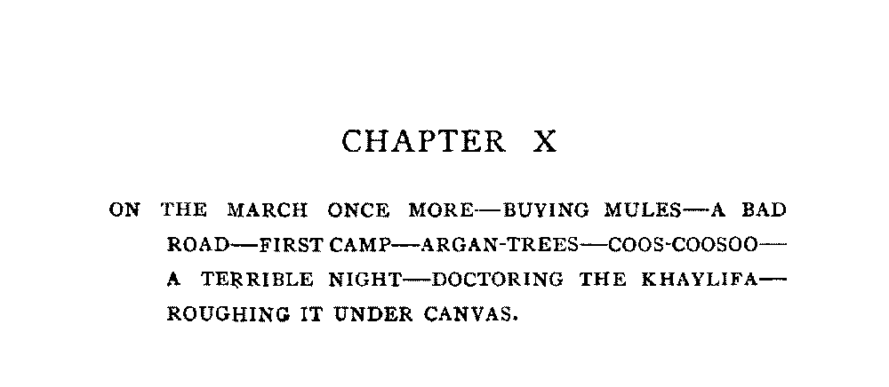 [ix]Chapter X | On the March Once More—Buying Mules—A Bad Road—First Camp—Argan-Trees—Coos-Coosoo—A Terrible Night—Doctoring the Khaylifa—Roughing it Under Canvas | 281 |