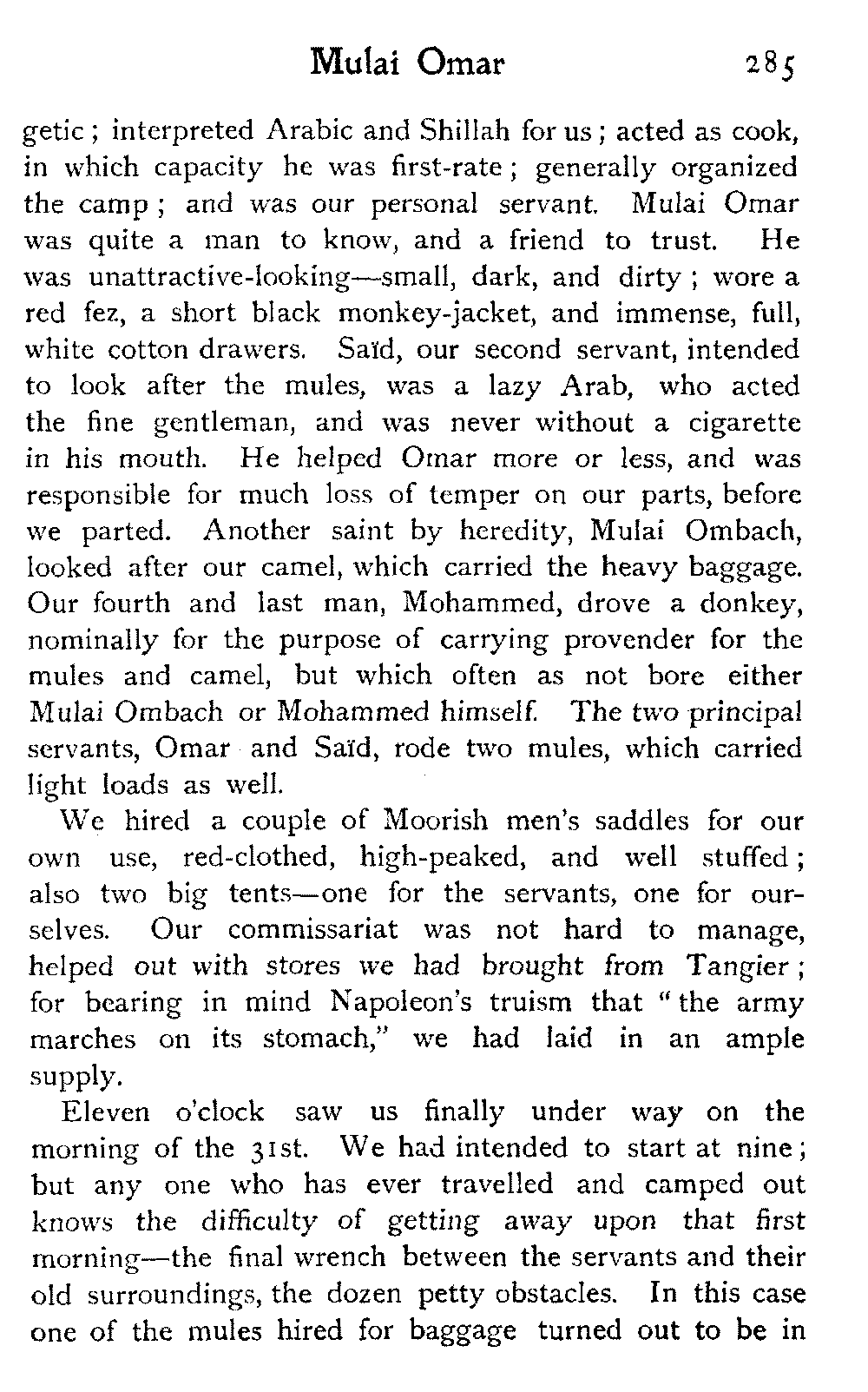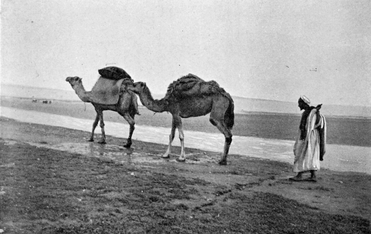 One evening our camel never turned up, and we fully expected to have had to sleep without beds or any other of the night's usual adjuncts. We had started that morning at seven, had ridden till twelve, had halted for an hour and a half, starting again at half-past one, and riding till half-past five; and all the way, after a mile out of Sok-el-Tleta, where we watered the mules at a pond and the trail forked, we were on the wrong road.