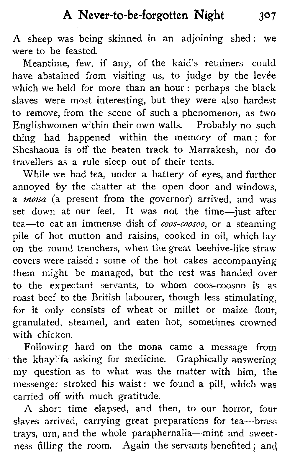 Chapter XI | A Parting Mona—Fording Sheshaoua River—Jars of Food—First Sight of Marrakesh—A Perilous Crossing—Ride into Marrakesh—The Slave Market | 311 |