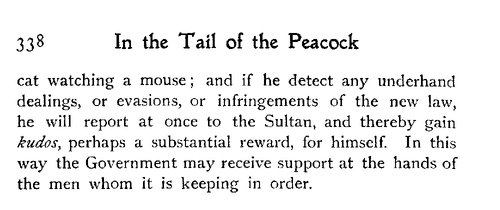 The old Oriental policy of the "balance of jealousies" will doubtless play its useful part: that is to say, each governor will watch his next-door neighbour like a[338] cat watching a mouse; and if he detect any underhand dealings, or evasions, or infringements of the new law, he will report at once to the Sultan, and thereby gain kudos, perhaps a substantial reward, for himself. In this way the Government may receive support at the hands of the men whom it is keeping in order.