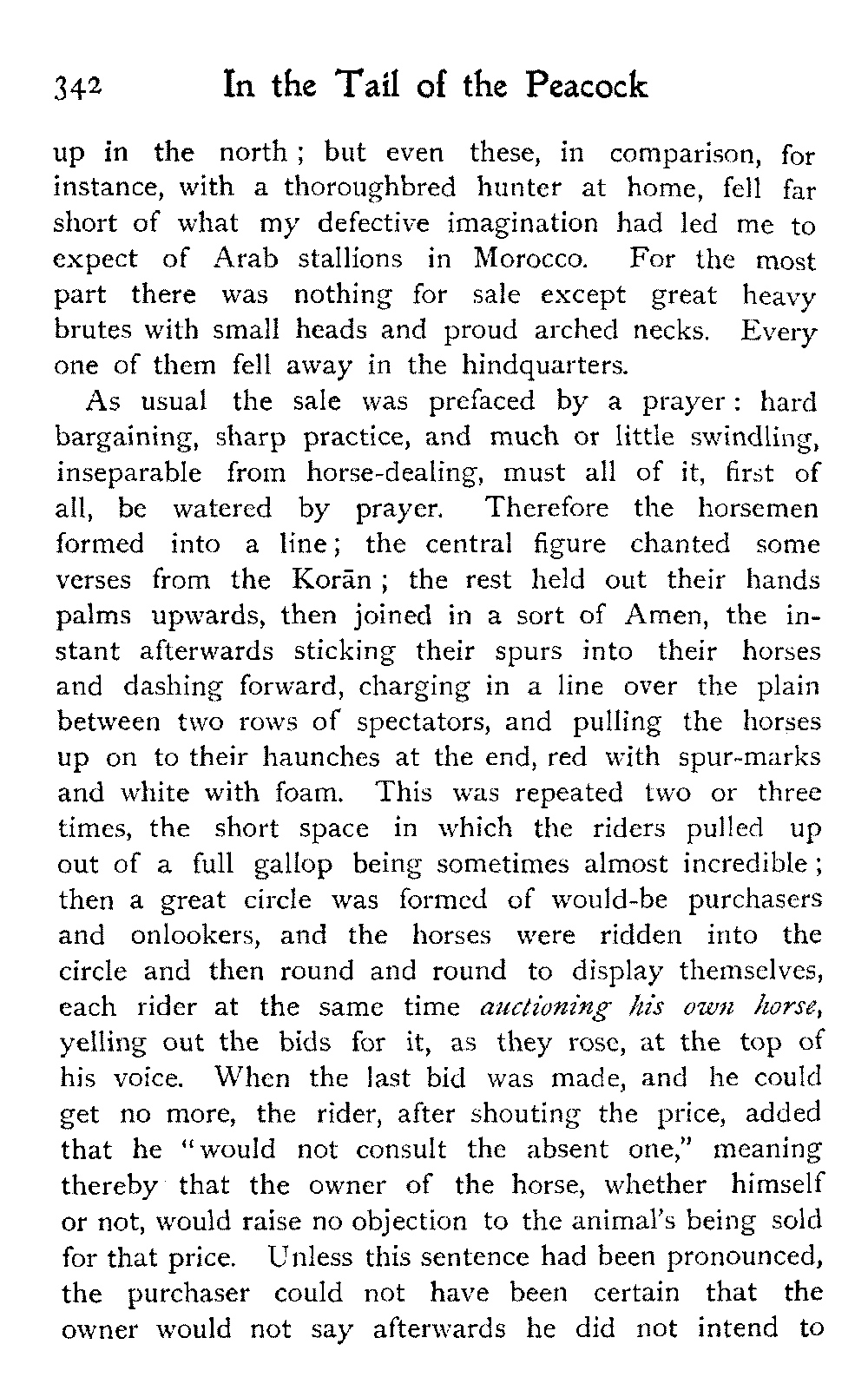 As usual the sale was prefaced by a prayer: hard bargaining, sharp practice, and much or little swindling, inseparable from horse-dealing, must all of it, first of all, be watered by prayer. Therefore the horsemen formed into a line; the central figure chanted some verses from the Korān; the rest held out their hands palms upwards, then joined in a sort of Amen, the instant afterwards sticking their spurs into their horses and dashing forward, charging in a line over the plain between two rows of spectators, and pulling the horses up on to their haunches at the end, red with spur-marks and white with foam. This was repeated two or three times, the short space in which the riders pulled up out of a full gallop being sometimes almost incredible; then a great circle was formed of would-be purchasers and onlookers, and the horses were ridden into the circle and then round and round to display themselves, each rider at the same time auctioning his own horse, yelling out the bids for it, as they rose, at the top of his voice. When the last bid was made, and he could get no more, the rider, after shouting the price, added that he "would not consult the absent one," meaning thereby that the owner of the horse, whether himself or not, would raise no objection to the animal's being sold for that price. Unless this sentence had been pronounced, the purchaser could not have been certain that the owner would not say afterwards he did not intend to[343] sell for that sum. Most of the horses fetched from three pounds twelve to four pounds ten.