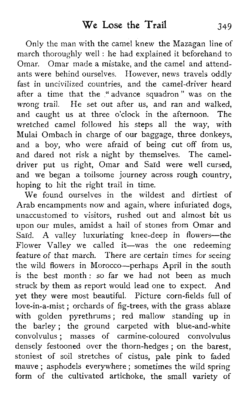 We found ourselves in the wildest and dirtiest of Arab encampments now and again, where infuriated dogs, unaccustomed to visitors, rushed out and almost bit us upon our mules, amidst a hail of stones from Omar and Saïd. A valley luxuriating knee-deep in flowers—the Flower Valley we called it—was the one redeeming feature of that march. There are certain times for seeing the wild flowers in Morocco—perhaps April in the south is the best month: so far we had not been as much struck by them as report would lead one to expect. And yet they were most beautiful. Picture corn-fields full of love-in-a-mist; orchards of fig-trees, with the grass ablaze with golden pyrethrums; red mallow standing up in the barley; the ground carpeted with blue-and-white convolvulus; masses of carmine-coloured convolvulus densely festooned over the thorn-hedges; on the barest, stoniest of soil stretches of cistus, pale pink to faded mauve; asphodels everywhere; sometimes the wild spring form of the cultivated artichoke, the small variety of[350] the ice-plant, the larkspur, the lupin, and several varieties of lavender. All these we met with, over and over again: rarer plants were to be found for the looking. R. collected specimens of them all, to be classified by the authorities at Kew Gardens on our return.
