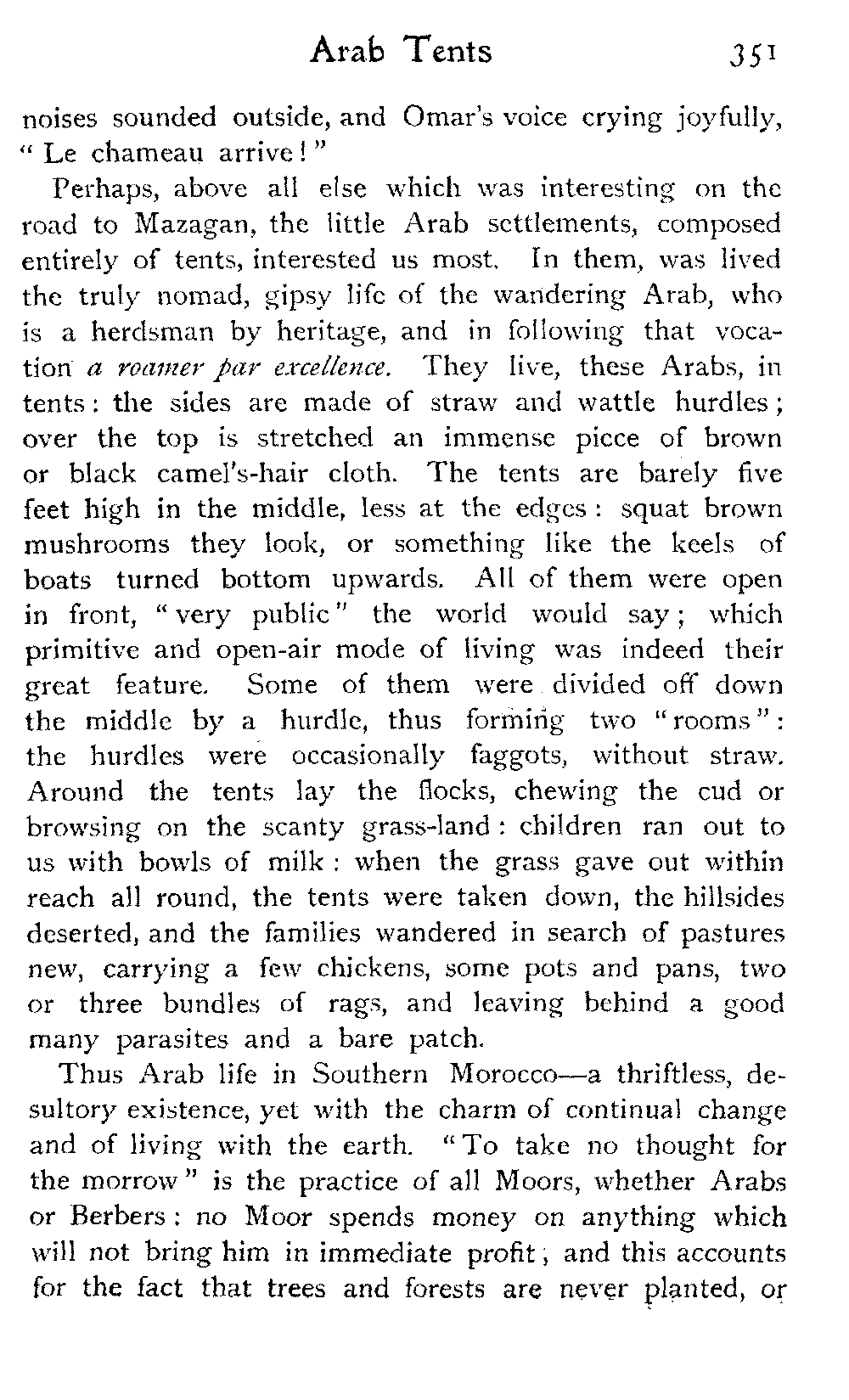 Perhaps, above all else which was interesting on the road to Mazagan, the little Arab settlements, composed entirely of tents, interested us most. In them, was lived the truly nomad, gipsy life of the wandering Arab, who is a herdsman by heritage, and in following that vocation a roamer par excellence. They live, these Arabs, in tents: the sides are made of straw and wattle hurdles; over the top is stretched an immense piece of brown or black camel's-hair cloth. The tents are barely five feet high in the middle, less at the edges: squat brown mushrooms they look, or something like the keels of boats turned bottom upwards. All of them were open in front, "very public" the world would say; which primitive and open-air mode of living was indeed their great feature. Some of them were divided off down the middle by a hurdle, thus forming two "rooms": the hurdles were occasionally faggots, without straw. Around the tents lay the flocks, chewing the cud or browsing on the scanty grass-land: children ran out to us with bowls of milk: when the grass gave out within reach all round, the tents were taken down, the hillsides deserted, and the families wandered in search of pastures new, carrying a few chickens, some pots and pans, two or three bundles of rags, and leaving behind a good many parasites and a bare patch.