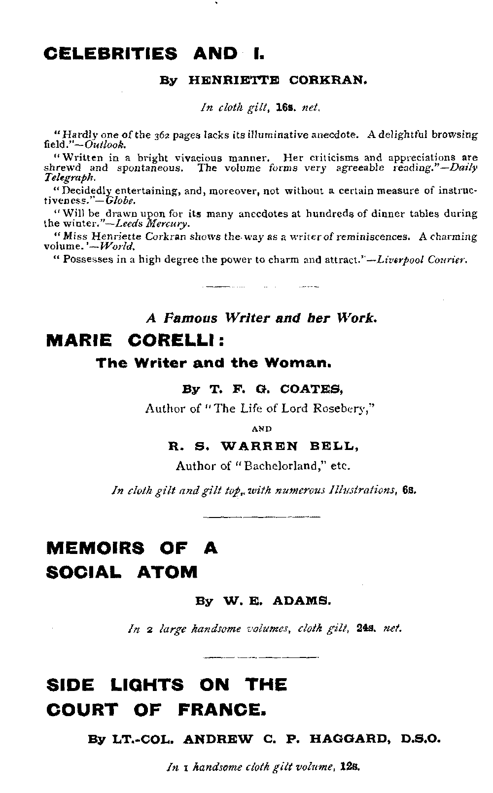 "Miss Henriette Corkran shows the way as a writer of reminiscences. A charming volume."—World.