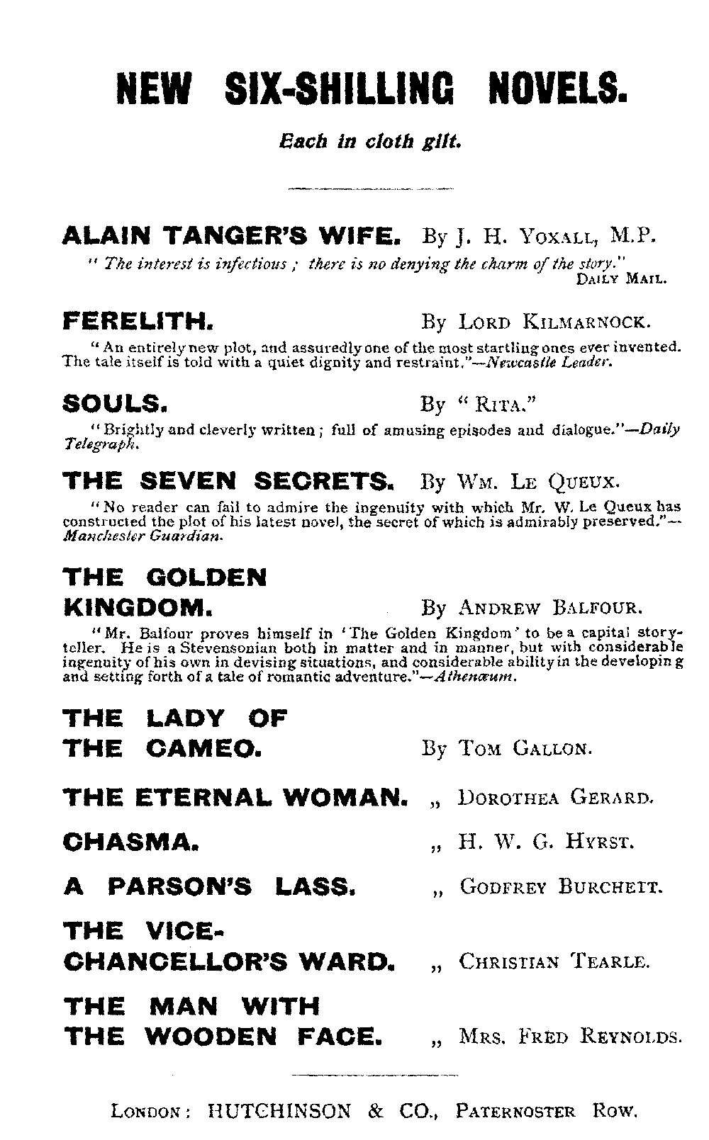"An entirely new plot, and assuredly one of the most startling ones ever invented. The tale itself is told with a quiet dignity and restraint."—Newcastle Leader.