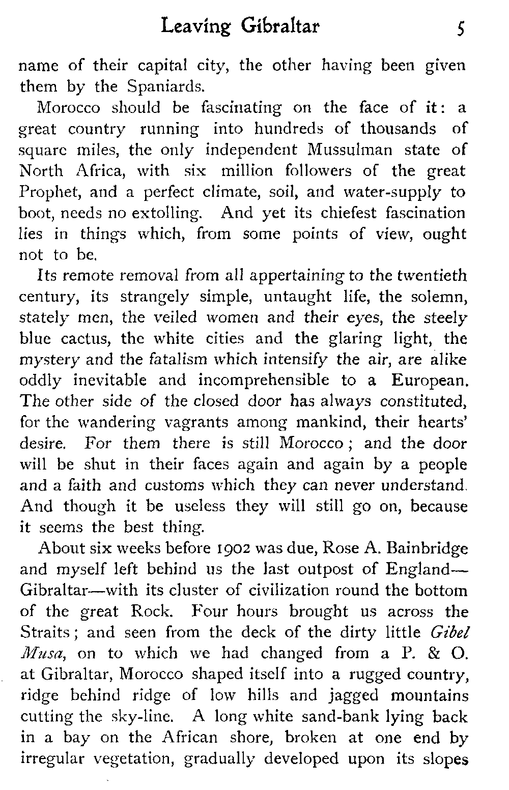 About six weeks before 1902 was due, Rose A. Bainbridge and myself left behind us the last outpost of England—Gibraltar—with its cluster of civilization round the bottom of the great Rock. Four hours brought us across the Straits; and seen from the deck of the dirty little Gibel Musa, on to which we had changed from a P. & O. at Gibraltar, Morocco shaped itself into a rugged country, ridge behind ridge of low hills and jagged mountains cutting the sky-line. A long white sand-bank lying back in a bay on the African shore, broken at one end by irregular vegetation, gradually developed upon its slopes[6] a yellowish-white, fantastic city, which resolved itself into Tangier.
