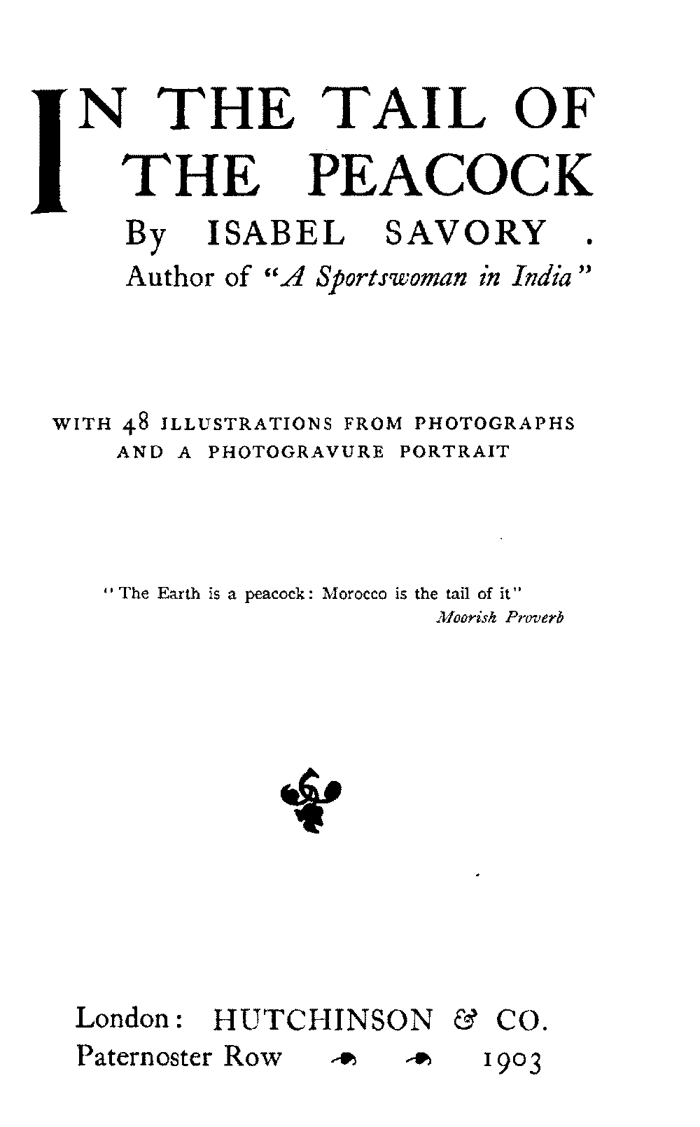 The Project Gutenberg EBook of In the Tail of the Peacock, by Isabel Savory This eBook is for the use of anyone anywhere at no cost and with almost no restrictions whatsoever. You may copy it, give it away or re-use it under the terms of the Project Gutenberg License included with this eBook or online at www.gutenberg.org Title: In the Tail of the Peacock Author: Isabel Savory Release Date: February 7, 2009 [EBook #28016] Language: English Character set encoding: ISO-8859-1 *** START OF THIS PROJECT GUTENBERG EBOOK IN THE TAIL OF THE PEACOCK *** Produced by Michael Ciesielski, the Project Gutenberg Online Distributed Proofreading Team at http://www.pgdp.net and the booksmiths at http://www.eBookForge.net