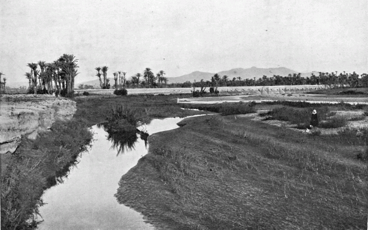The great Thursday Market is one of those things in Marrakesh which, once seen, is stamped deeper than a hundred other memories upon the mind. It is held in a sun-baked open space outside the Gate of the Thursday Market, just beyond the city walls, within view of the plains and a distant low range of mountains. Thousands and thousands of tall palms, groves of them, wave in the wind all over the surrounding country: a few great watercourses, worn and eaten out of the red soil, burrow between the forests on their way down to the great river.