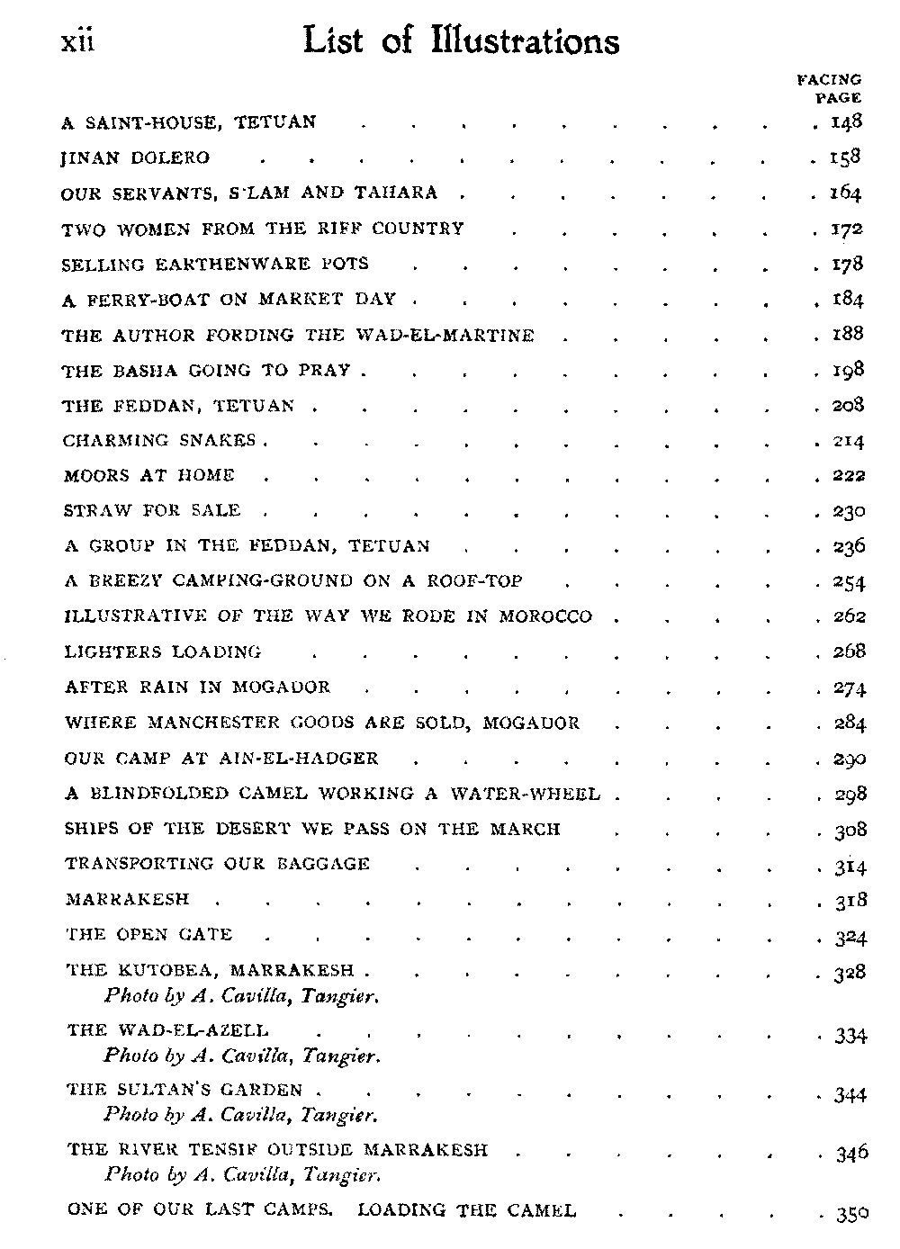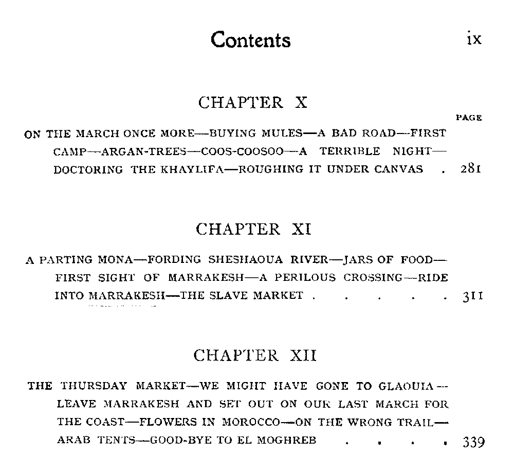Chapter XII | The Thursday Market—We Might have gone to Glaouia—Leave Marrakesh and set out on Our Last March for the Coast—Flowers in Morocco—On the Wrong Trail—Arab Tents—Good-Bye to El Moghreb | 339 |
