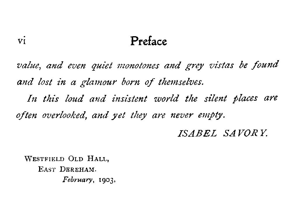 If to live is to know more, and to know more only to love more, the least eventful day may possess a minimum of[vi] value, and even quiet monotones and grey vistas be found and lost in a glamour born of themselves.