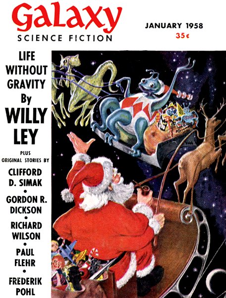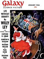 In the next place, she said, between trips to the powder room, "It must take a lot of courage to sign up for something like that. Were you scientifically inclined in school? Don't you have to know an awful lot to be a space-flyer? Did you ever see any of those little monkey characters they say live on Mars? I read an article about how they lived in little cities of pup-tents or something like that—only they didn't make them, they grew them. Funny! Ever see those? That trip must have been a real drag, I bet. What is it, nine months? You couldn't have a baby! Excuse me— Say, tell me. All that time, how'd you—well, manage things? I mean didn't you ever have to go to the you-know or anything?"