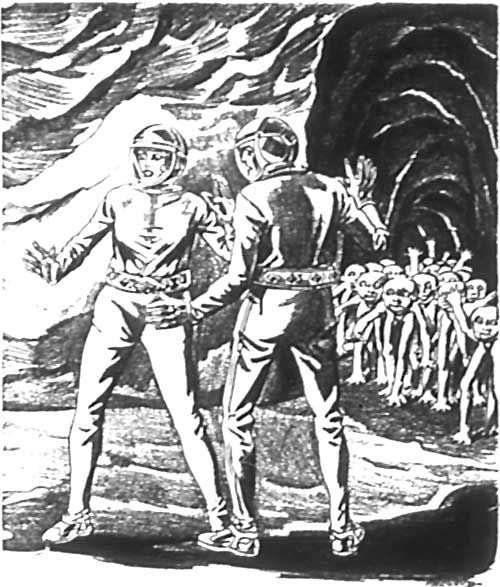 Yet the impression was one of calm and quiet, and the waifs from other worlds felt a surcease of nervous tension. Unconsciously they relaxed. Taking their bearings, they changed their course slightly for the nesting place of the nearest tribe of Inranians where they hoped to get food and at least partial shelter; for their food tablets had mysteriously turned to an unpleasant viscous liquid, and their sleeping bags were alive with giant bacteria easily visible to the eye.