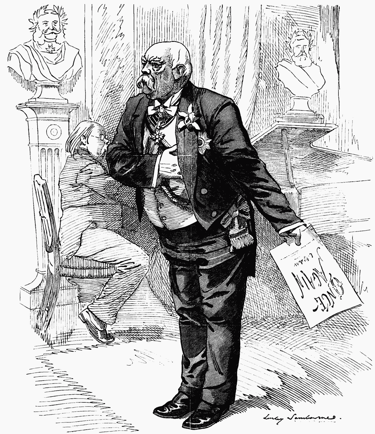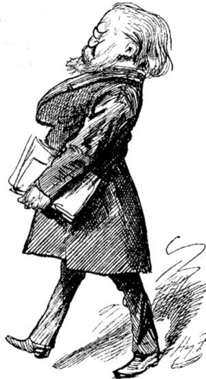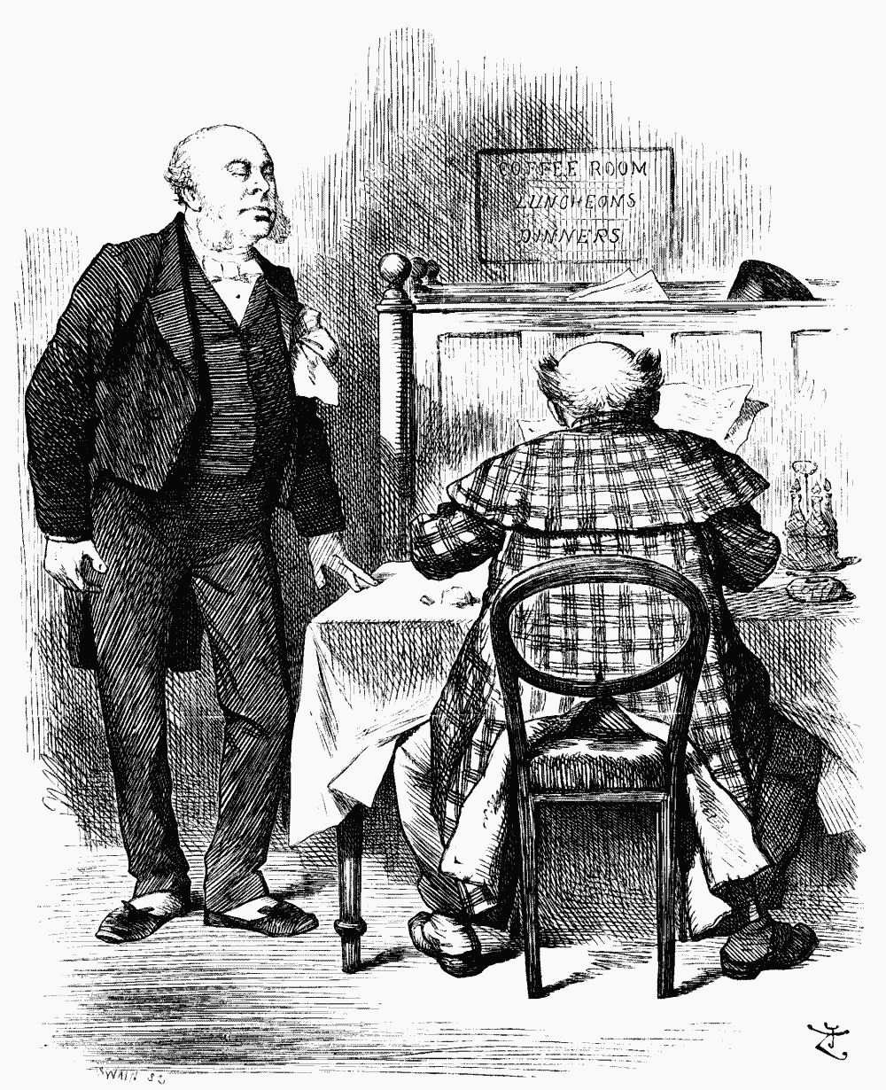 Very few Members present. Getting on for dinner-hour. General conviction that it's going to be a dull night. Nothing can help it. But Gladstone waits, and presently, attracted by Lees' superb sense of superiority, sits with hand to ear, listening with kindly smile. Nothing delights Grand Old Man so much as youth, especially aggressive youth—youth that knows about everything, with fuller information and judgment more accurate than its elders. This is what, years ago, first attracted him to Randolph. Now sits listening while Young Twenty-Nine, who represents Omniscience and Oldham, in drawling voice, hesitating for a word, but having no hesitation in keeping the House waiting for it, settles the question that for two years has riven parties and convulsed continents.