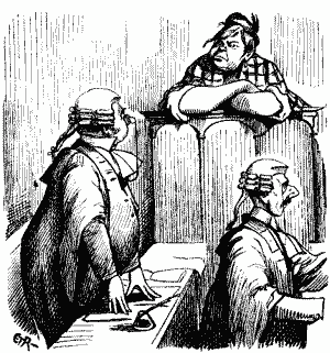 Hick-Beach followed; but spell broken; the listening throng, filling the chamber from floor to topmost range of gallery, swiftly melted away. Thus it came to pass there were few to see Harcourt as presently he went forth whimpering. He, the champion slogger, accustomed to rampage round the tents of the enemy, and bring his shillelagh down on any head accidentally protruding, had been himself attacked. Hicks-Beach girded at him to-night in comparatively gentle fashion. Harcourt tossed about on bench and pettishly protested; claimed Speaker's protection; Speaker declined to interfere. Then, digging lusty knuckles into moist eyes, he sobbed, "I—I—am not going to stay to be abused in this manner; shan't play!" and so went forth, amid the jeers and mocking laughter of naughty boys opposite. Business done.—Debate on Parnell Commission Report opened.
