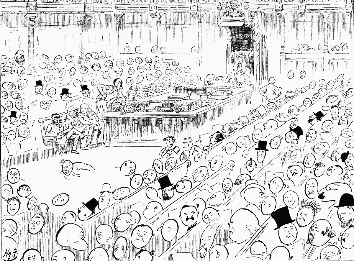 Friday Night.—Supposed to have reached full tide of surging Debate to-night. Been piling up agony all week. Now nearing crisis. Lobbies thrilling with excitement; corridors crowded with senators; competition for Speaker's eye threatens personal danger. A great occasion, a memorable struggle. That's the sort of thing imagined outside by ingenuous public. Fact is, when Speaker came back from chop at twenty minutes to nine, House almost as empty as on Wednesday afternoon. Count called; bell rang; only thirty-five Members mustered; no quorum; adjourned.