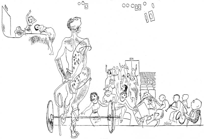 Each night at 8:30 I went to a theatre in a place called Times Square and put on my act. Thousands of people paid to see me. I was very well paid. There is a newspaper here called "Variety." It carried an article about me. The headline said: STRONG MAN TERRIF WOW SOCKEROO 100G 3D. The numbers at the end mean the theatre took in $100,000 during my third week. After the article appeared every seat was sold weeks in advance.
