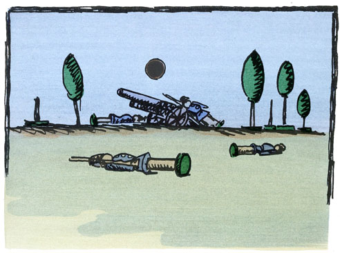 N'ayant plus de soldats de plomb à abattre, le petit garçon, voulant se servir de son canon, se mit à tirer sur la bergerie et sur le village.