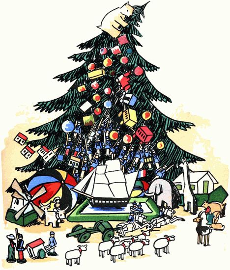 Des pantins bariolés sautaient adroitement sur le coin des meubles et s'y asseyaient sans façon; une locomotive suivie de ses wagons bondissait à travers les rameaux de l'arbre et s'y accrochait.