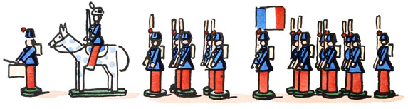 Lorsque sa tunique bleue fut sèche, on lui colla un bras de bois de chaque côté du corps; on lui colla ensuite un fusil jaune le long du bras droit, un sac brun sur le dos, un pompon rouge sur son shako et, sous les pieds, en guise de godillots, une large et confortable rondelle verte, au centre de laquelle il se tint bien campé, prêt à recevoir victorieusement tous les chocs.