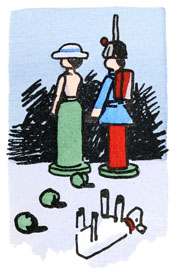 Quillembois et la bergère se regardèrent donc pendant des jours et des jours jusqu'à ce qu'on vint les en empêcher en mettant un couvercle sur la boîte où se trouvait le petit soldat.